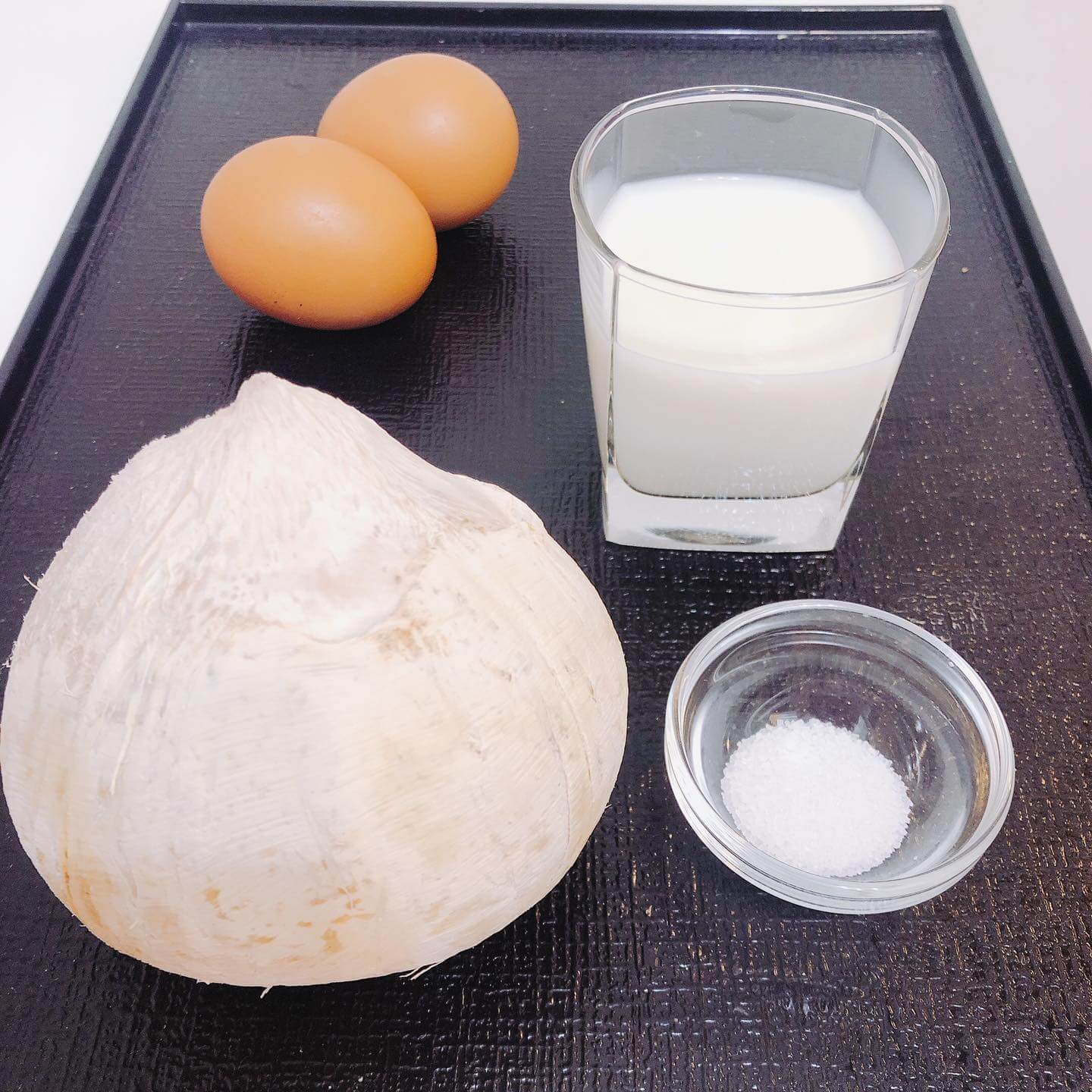 - 將蛋白打散後加入鮮奶及椰皇水中攪匀,過篩備用。