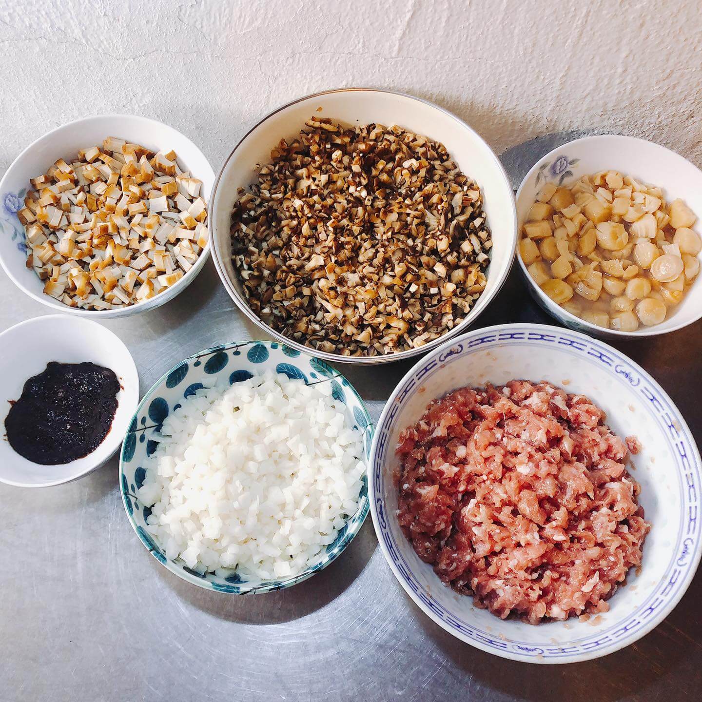 - 在同一個鑊,放入免治豬肉,炒約5分鐘,至轉色,加入柱侯醬、元貝、及已炒香的冬菇粒及豆腐乾粒,續炒至乾身及豬肉熟透。