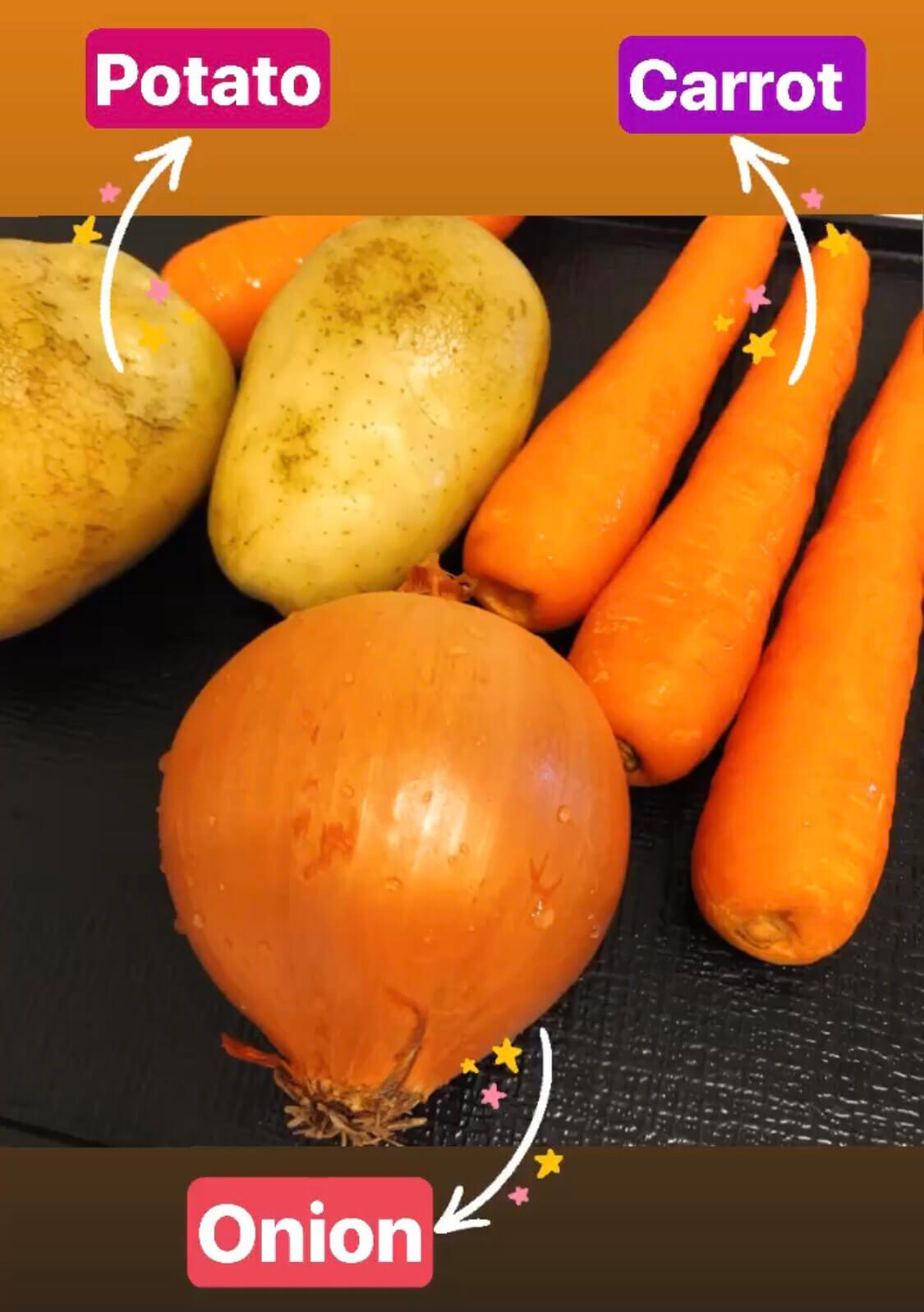 - 加入馬鈴薯、甘筍和洋蔥略炒。