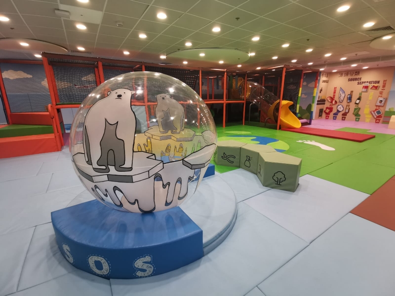 聯和墟體育館的遊戲室主題為環保小先鋒,大家可以見到看多環保相關的內容,包括:慳神、北極熊求救及源頭分類等,小朋友可以邊玩邊學到生活小知識。這遊戲室的入場限額為24人,派籌時間為使用時段開始前30分鐘。每節開放時間為30鐘,每一節後關閉15分鐘作進行清潔。