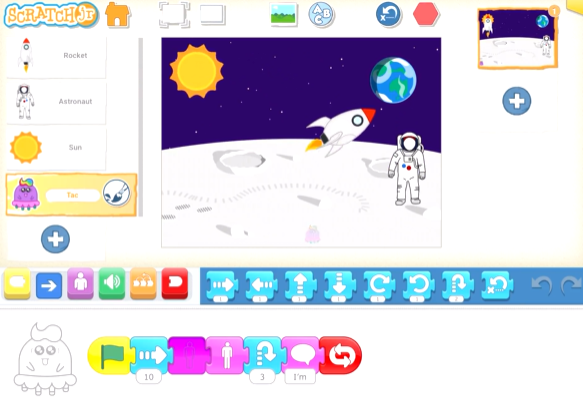 - ScratchJr:打破界限,讓小朋友的想像不再停留在腦海,透過拖拉圖像式指令,將構想的故事創作成為有聲有畫的動畫