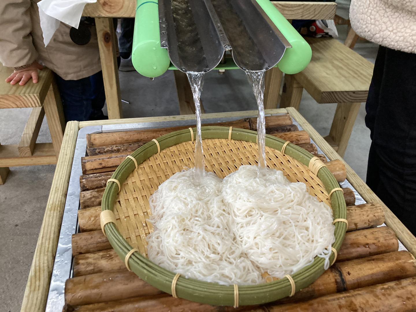 製作完麵線,活動就來到第二個環節–流水麵,一開始會有山泉水流出,大家就可以專注地等麵線流出來。豬仔包雖然站在最後的位置,但其實前面的人一不留神,麵線就會流走,所以在最後的位置仍然有好多麵線可以夾。當第一輪結束後,大家開始沒有那麼雀躍時,又會出現不同顏色的麵線,吸引大家繼續努力夾,直到最後跌出提子就知道體驗完結了,