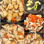 - 大鍋爆香薑片、蒜片、蔥段和乾蔥,下剩餘的免治豬肉炒香,加入冰糖,濽入紹興花雕酒,放入冬菇、秀珍菇和甘荀,倒入其餘調味料。