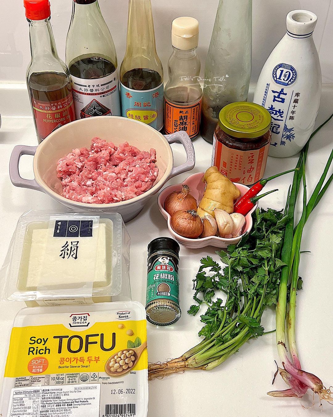材料:滑豆腐 1盒、免治豬肉 260g、芫荽根 4棵、薑粒 1茶匙、蒜頭 2瓣切碎、紅蔥頭 2粒切碎、紹興花雕酒 1茶匙、水 150ml、蔥 1棵切碎、指天椒 (可省略)