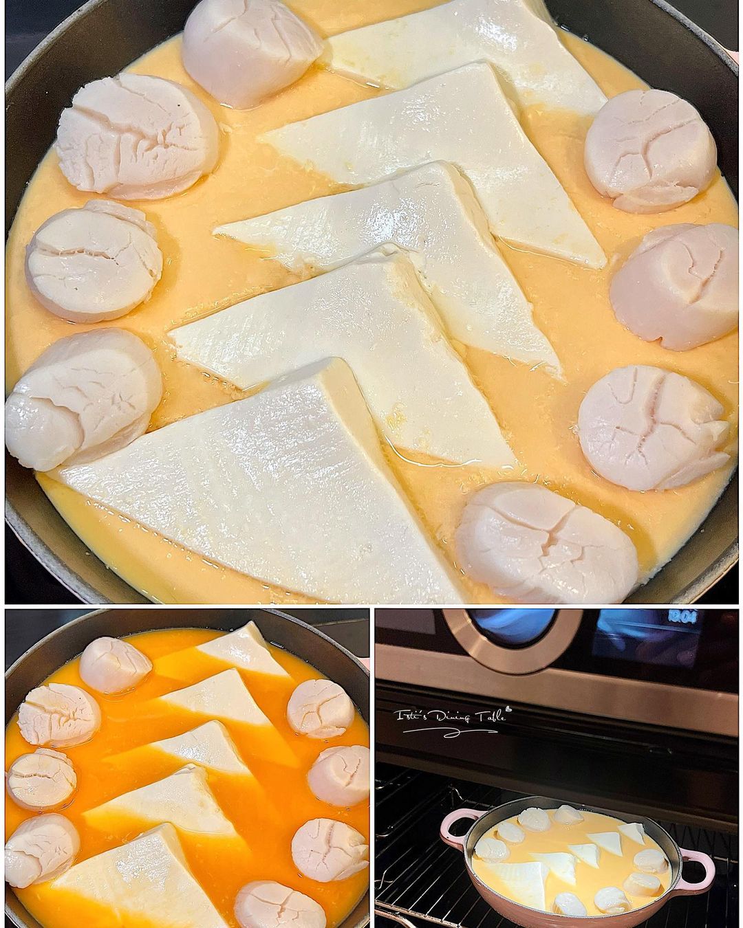 材料:雞蛋 3隻、帶子 8粒、豆腐 1盒、雞湯 250ml、蔥 1棵粒、生抽 2茶匙、杞子 8粒熱水浸軟 (可省略)