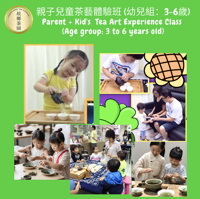 故鄉茶園設親子兒童茶藝體驗班,小朋友3歲起就可以和家長去參加,小朋友和家長一同在課程中認識中國傳統茶文化的活動及現代茶體驗和學習禮儀,除了豐富孩子們的知識,還能夠營造溫馨融洽的氛圍!在一性課程中可以學到的起源及傳播、辨清茶葉及種類、認識茶具及泡茶、茶禮及禮儀、挑選適合家長及孩子體質的茶飲!每組參加者仲會得到茶紀念品一份!