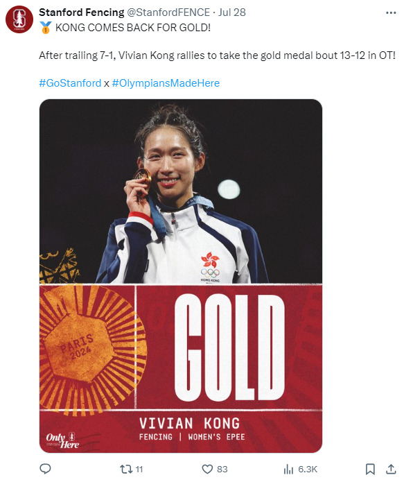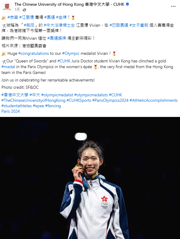 巴黎奧運|香港劍撃代表江旻憓(Vivian)在日前(28日)本港凌晨3點半時分,在巴黎奧運女子重劍個人賽決賽奪得金牌,戰勝東道主法國選手瑪露比(Auriane Mallo-Breton)。這位「世一」劍后能文能武,原來除了在運動方面有天賦、有實力,同時還是一名學霸,不用靠運動成績考入史丹福大學,後來更攻讀中國人民大學的法律碩士、香港中文大學法律博士課程。