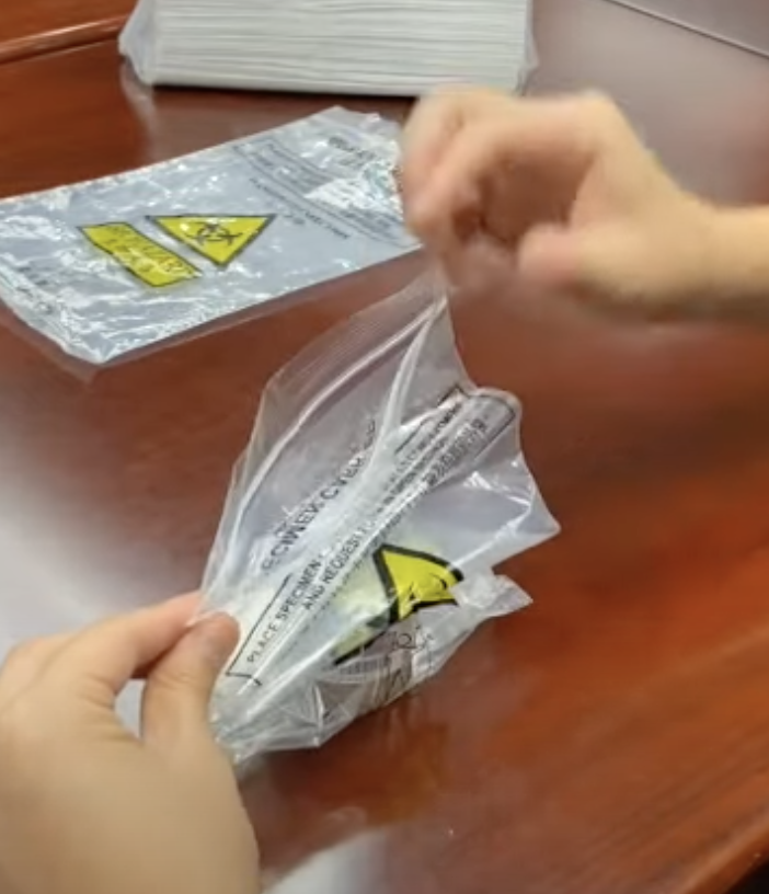 5. 把樣本瓶放入第一個樣本袋內,徹底清潔雙手並將樣本袋封好,確保樣本瓶垂直和沒有滲漏,將多餘空氣擠壓出來