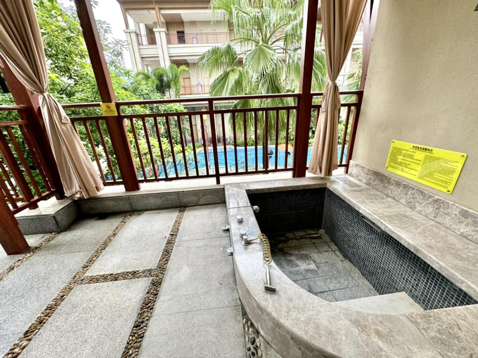 廣州森林海溫泉度假酒店位於4A級風景名勝區,20年開幕至今仍保持得新淨,還可以看到青山綠水的景觀。入住別墅區·溫泉別墅雙床房,房間內有露台私人獨立溫泉並設有窗簾,可以在私人度極高的情況下浸溫泉。此外,酒店設有2萬平方米的「室外森林溫泉」,有超過30款礦物溫泉池可以浸。