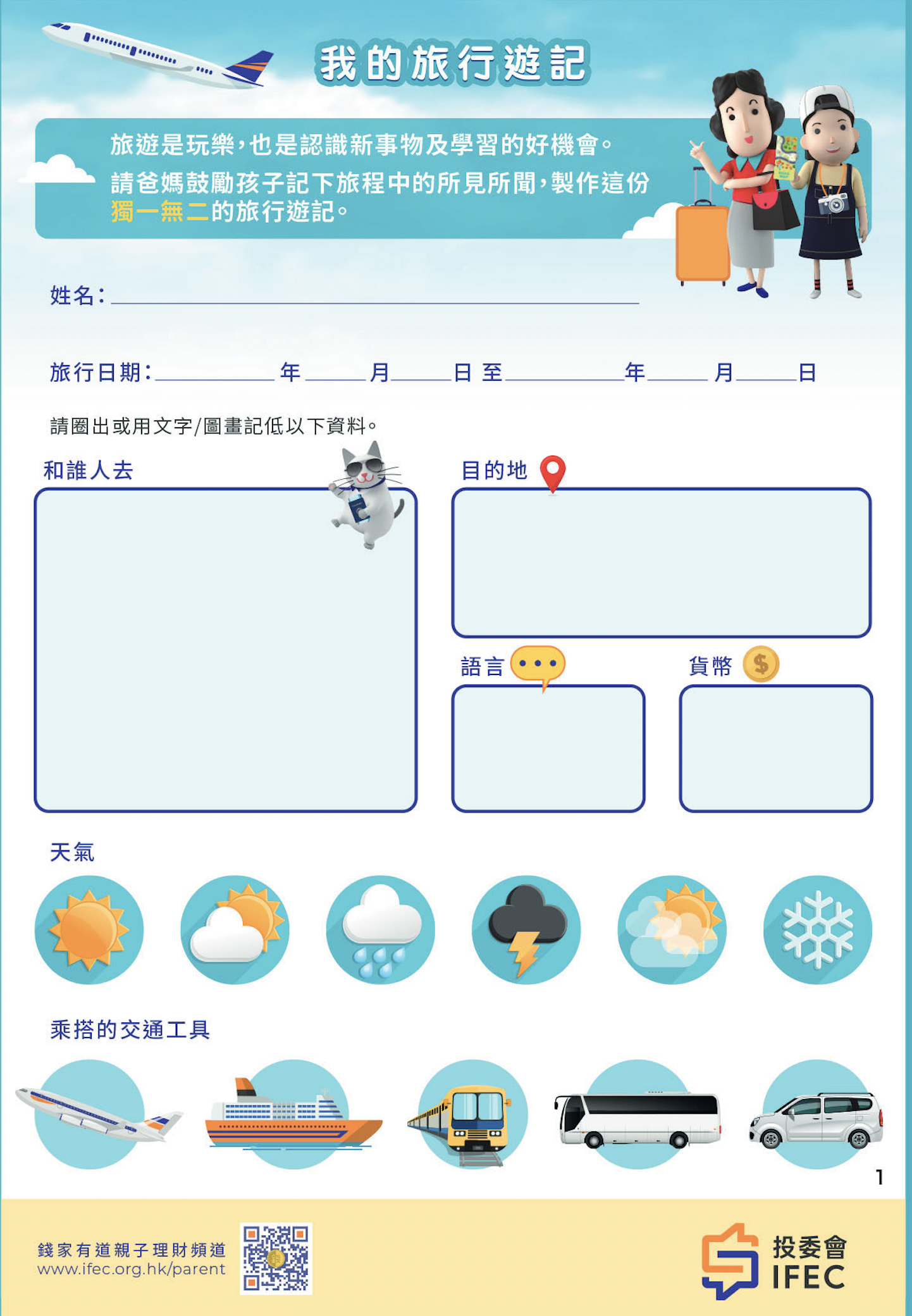 暑假臨近,不少家長都會趁着悠長假期帶子女親子旅行,來一趟本地遊或到外地走走,為他們帶來課堂以外的體驗。家長可藉親子旅遊期間向子女傳遞理財教育,利用由投資者及理財教育委員會(投委會)設計的「我的旅行遊記」,引導子女認識金錢、培養良好的消費態度和理財習慣。