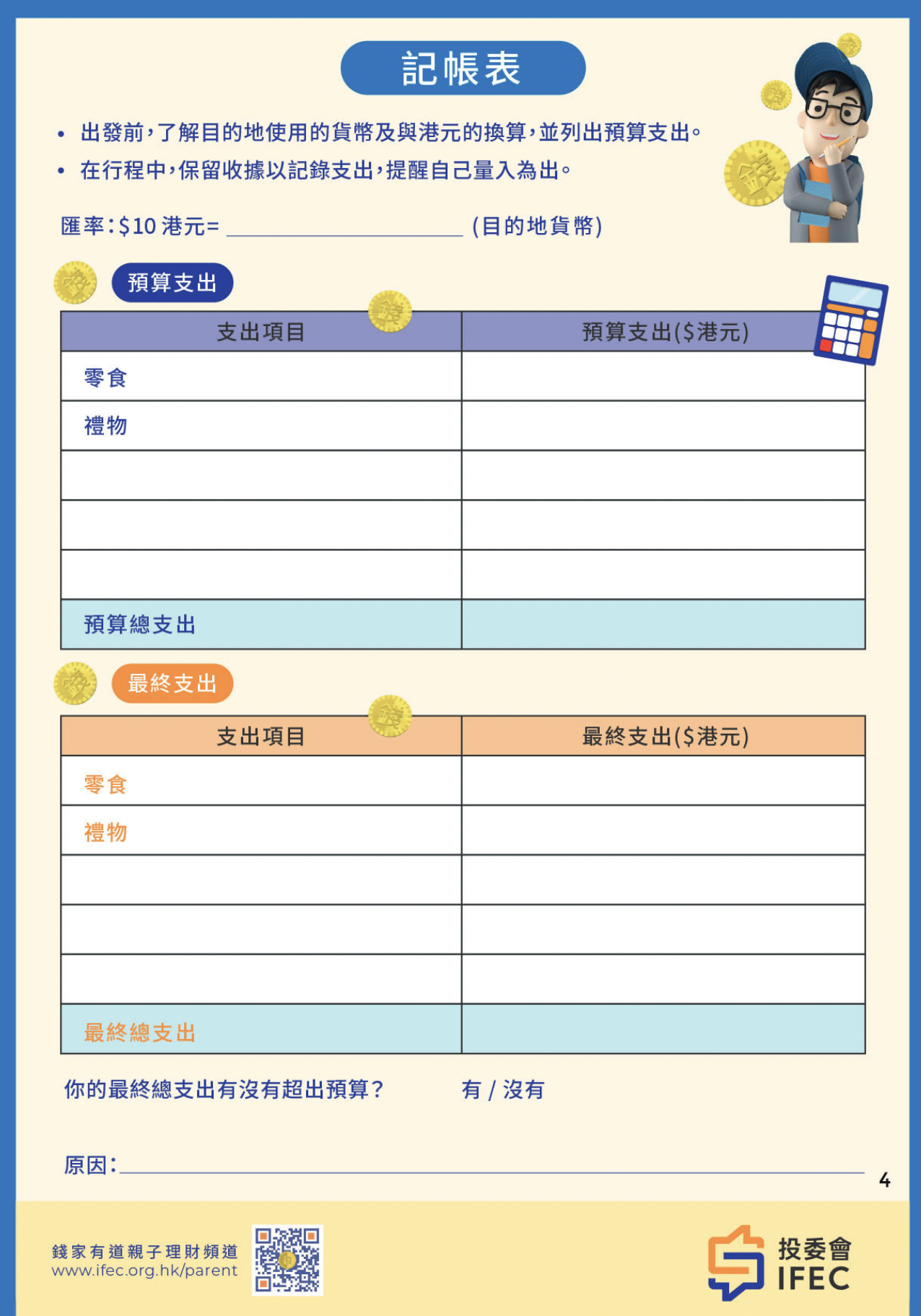 出發前,家長不妨與子女一起為行程訂立預算,令他們明白旅行會有各項支出。家長可以請孩子在遊記內列出使費預算,並按照預算編排行程。在旅程期間,子女可以收集旅程中的消費單據或景點門票,在遊記中記錄開支。