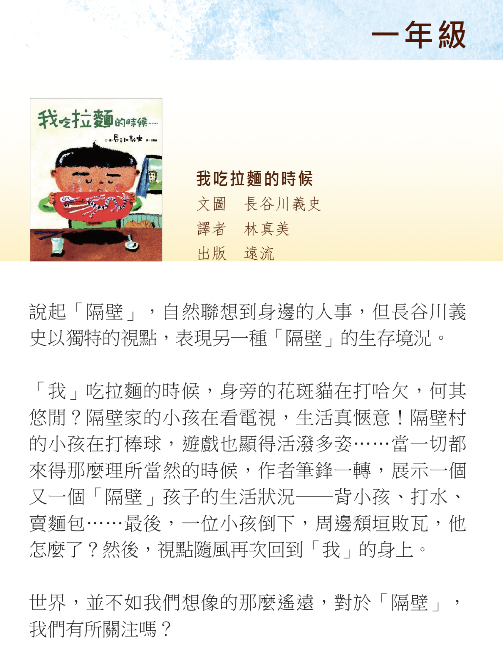 《童書‧童年》1以「關愛他人」為主題,推介書目包括:《我吃拉麵的時候》、《白貓黑貓》、《山下同學不說話》、《烏鴉,太郎》、《對不起,我不是故意的》、《狐狸的溜冰鞋》、《風兒吹我心》、《一百件洋裝》、《月牙兒》和《說謊的阿大》,讓爸媽與仔女一起閱讀,彼此交流,進而鼓勵孩子自行閱讀,培養他們懂得接納和愛護別人,發掘自己和他人美麗的心靈。