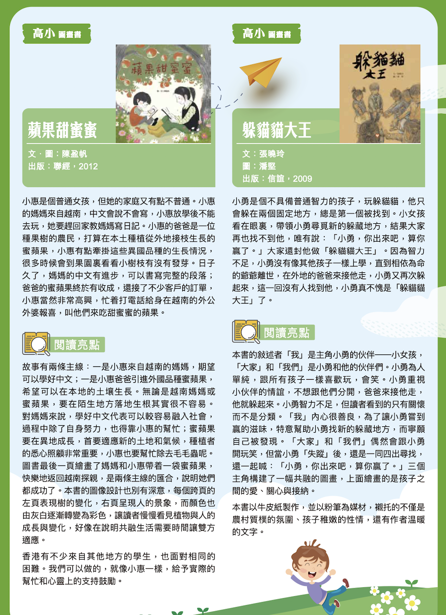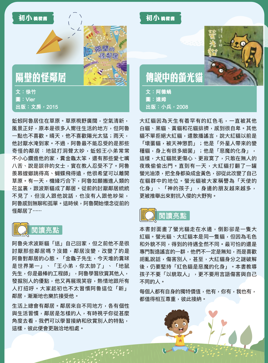 為持續培養學生的閱讀興趣,拓寬學生的閱讀面,提升閱讀能力和人文素養,教育局配合小學生的心理發展和成長需要,推薦優質的童書,包括「關愛他人」、「人與自然」、「尊重包容」及「友愛長存」4大主題,供小一至小六學生閱讀,讓他們獲得閱讀的樂趣,培育關愛、誠信、尊重他人、同理心等價值觀。