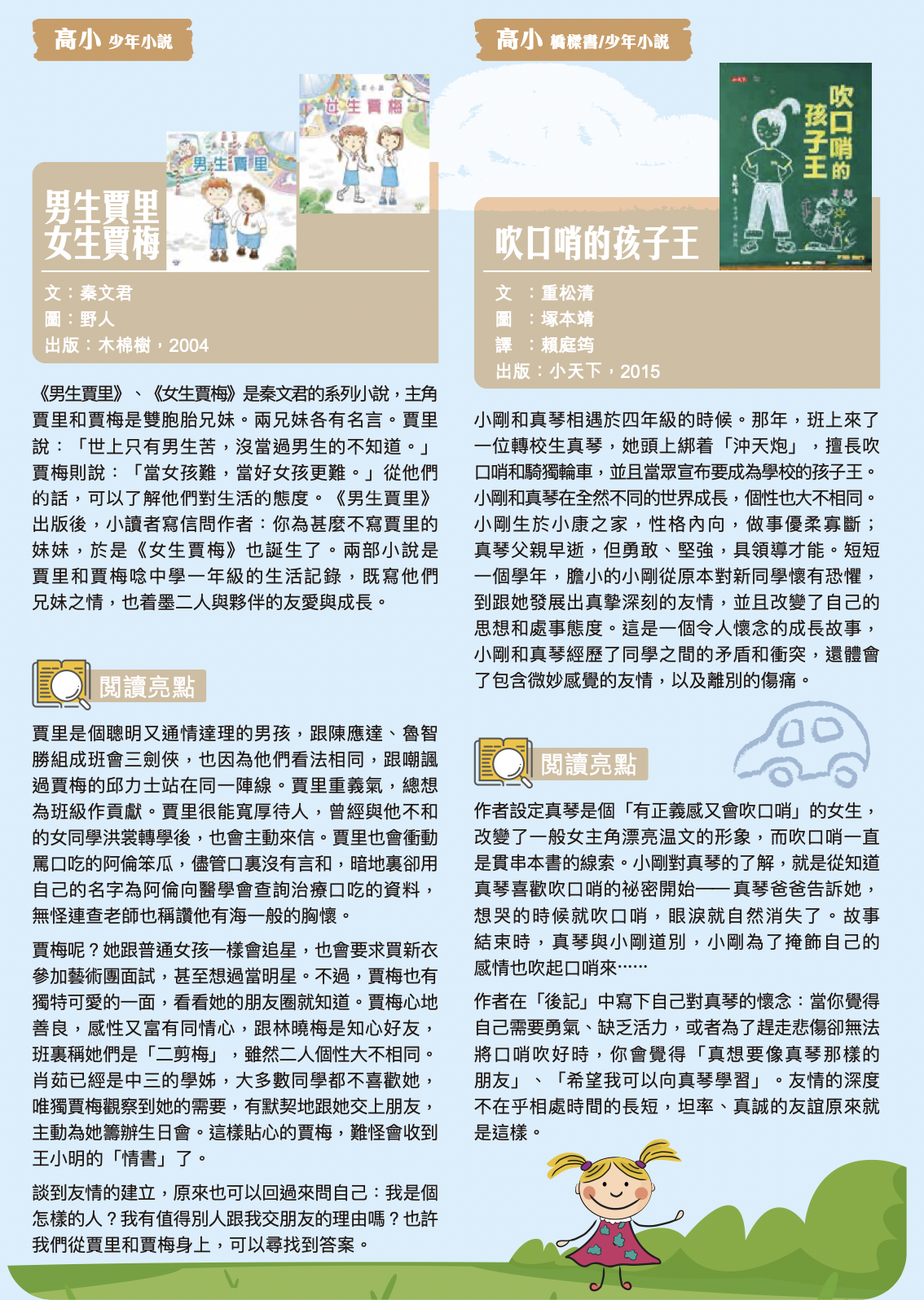 《童書・童年》推薦的書目橫跨了小學六個年級,類型始於圖文結合、意涵豐富的圖畫書,隨而循序向深微的文字世界邁進,期在提高孩子的閱讀能力之外,還增強他們鑑賞作品的能力,以至情感美善的培養。推薦書目除提供封面及基本出版資料外,更藉助內容簡介,及主題意蘊的闡釋,使爸媽對推薦書籍有初步理解,從而找來與孩子共讀,進而鼓勵自讀。