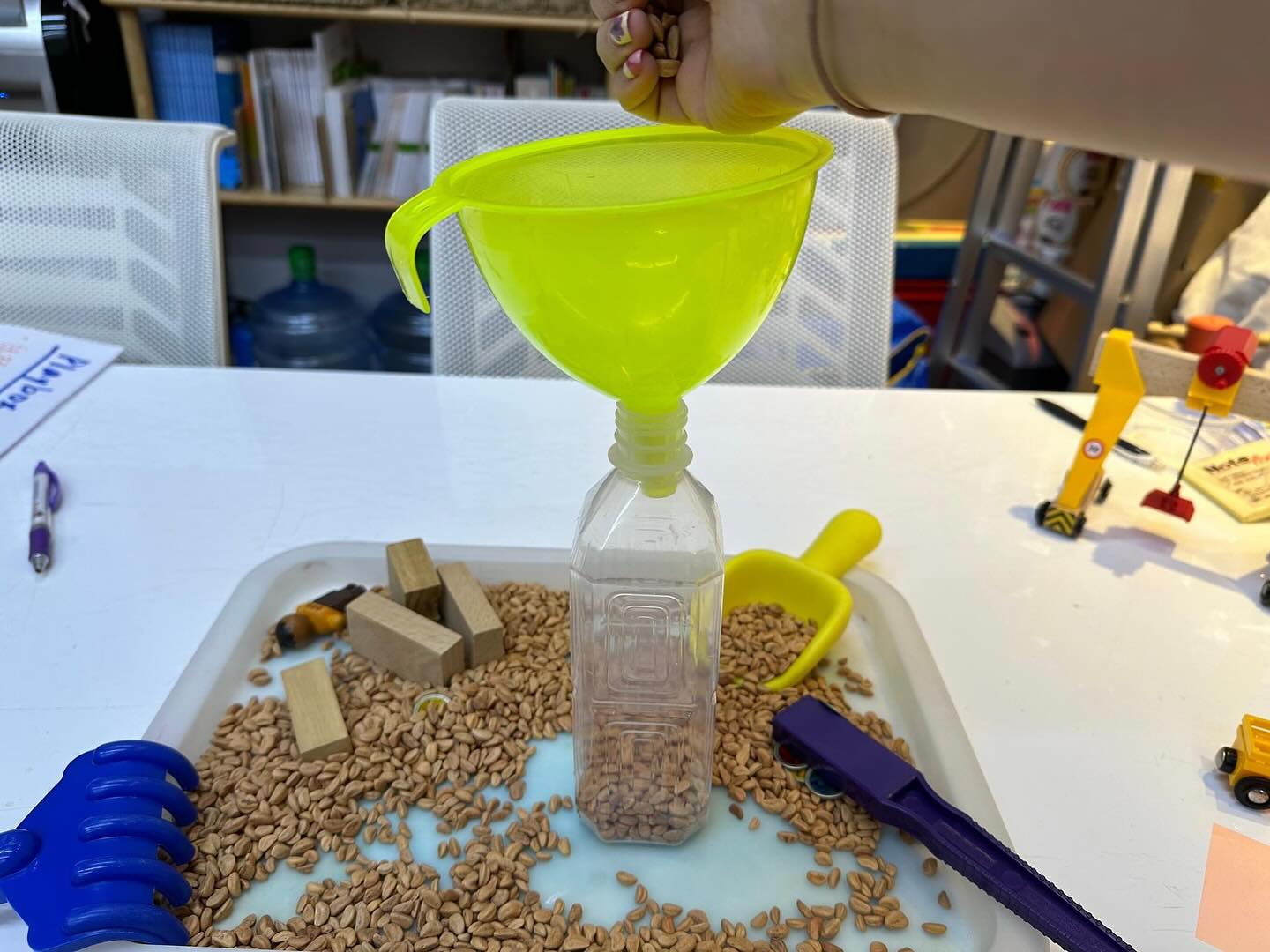 智樂遊戲萬象館最近在館內設有期間限定的室內沙灘污糟貓遊戲,讓小朋友可以在暑假期間涼快地玩沙。山楂籽沙有獨特觸感和清新涼快感,小朋友在沙池中伸手觸碰、隨意撥弄,挖掘找尋小貝殼,亦可以用漏斗和膠樽自製小沙槌。此外,沙池內還有方塊積木、管道、工程車、吊重建築玩具等,小朋友可以發揮想像力,天馬行空地玩樂。
