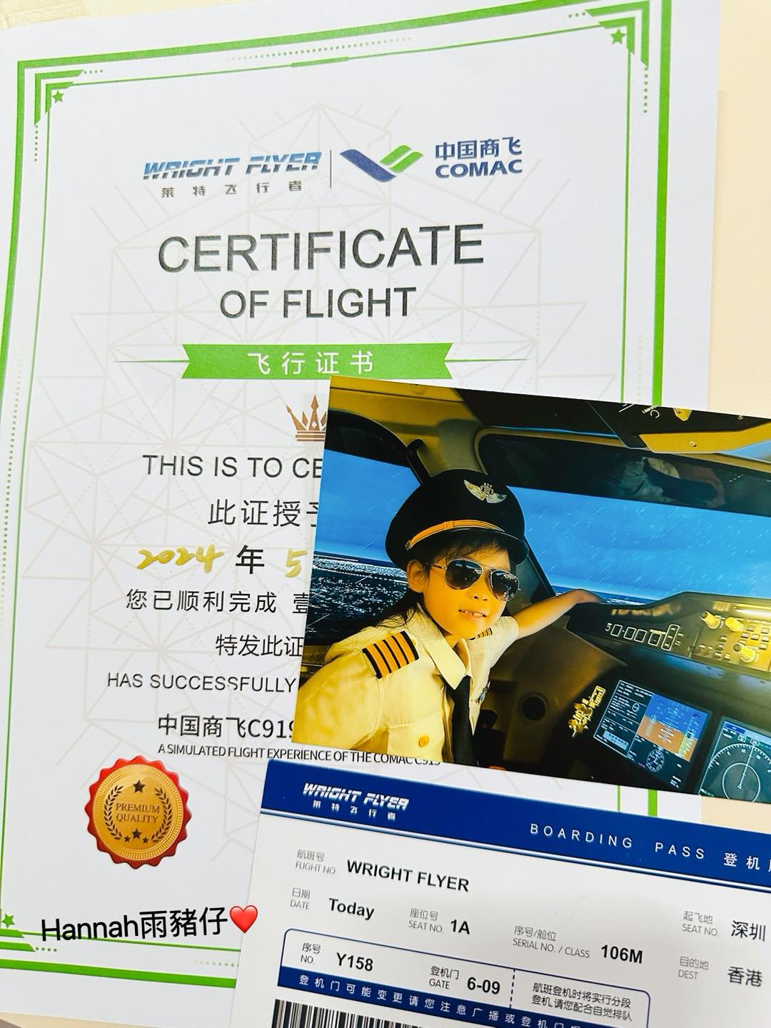 雨豬仔媽媽一家去到位於寶安區的歡樂港灣 ,無意中發現商場內有模擬駕駛飛機玩,$300可以駕駛15分鐘。工作人員幫小朋友換上制服,帶上機師帽和太陽眼鏡就可以去模擬駕駛室開始駕駛飛機!完成後,小朋友更可以獲得證書、相片和boarding pass留念。
