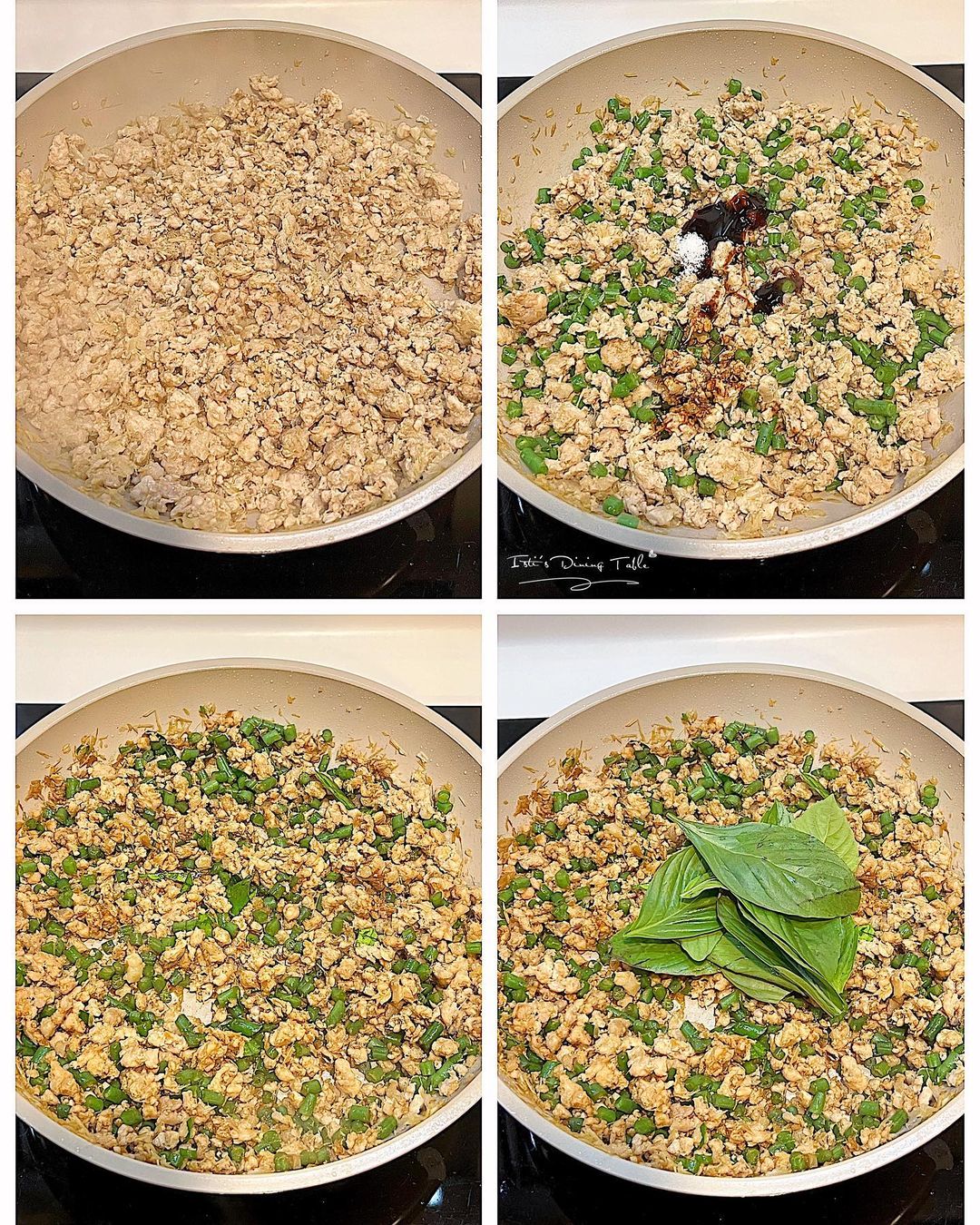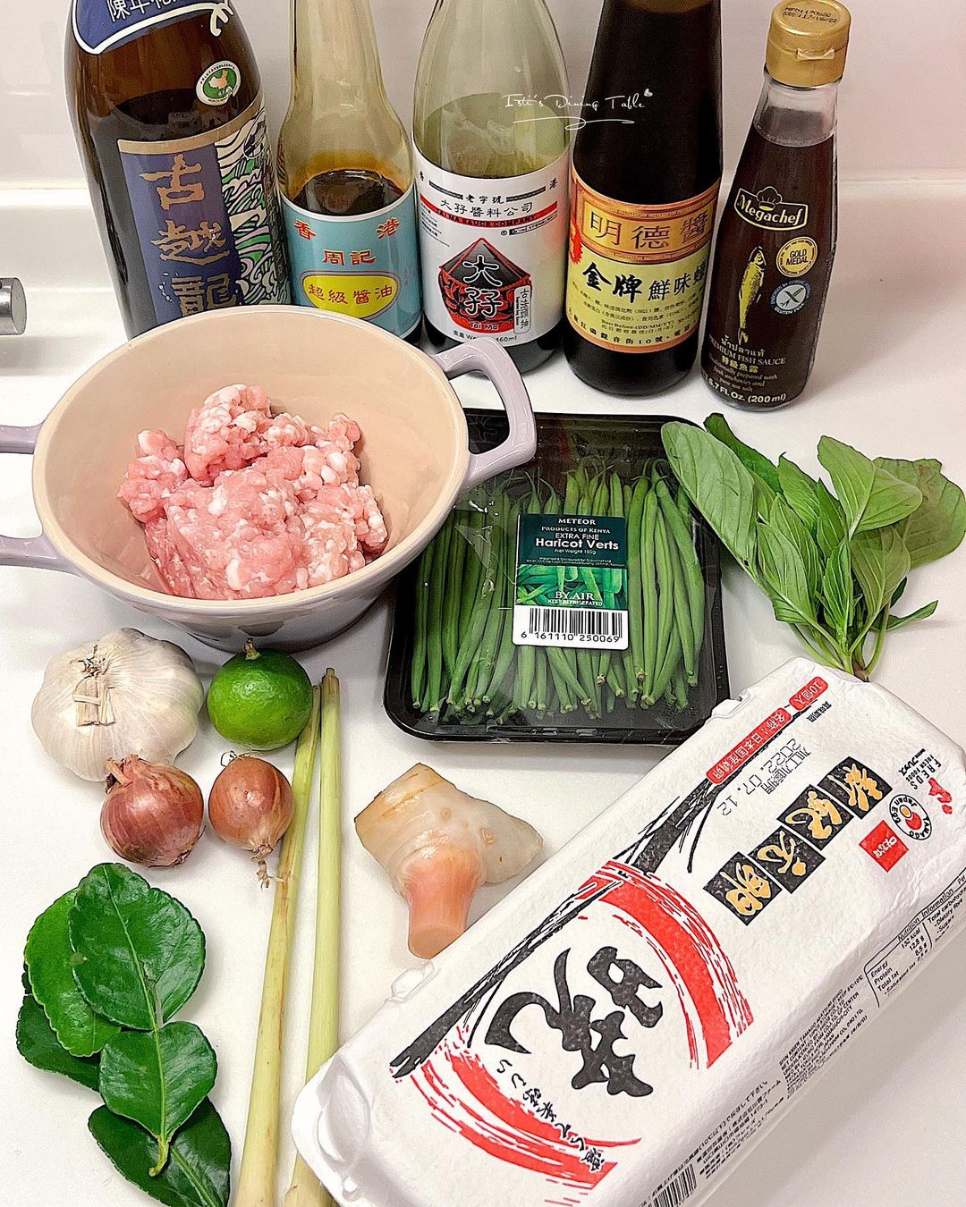 材料:免治豬肉 300g、豆角 100g切粒、香茅 1條拍扁切碎、南薑 1小塊切片、蒜頭 2粒切碎、乾蔥 2粒切碎、檸檬葉 4塊、九層塔 1棵(只取葉部分)、青檸汁 1茶匙