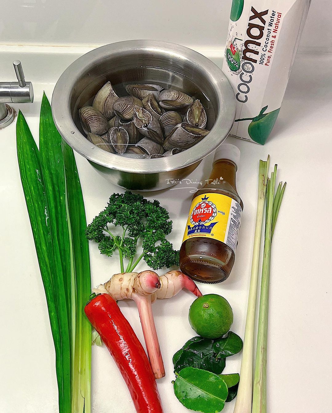 材料(2人份):蝴蝶蚌 1斤、椰子水 300ml、水 100ml、香茅 2條、南薑 4片、檸檬葉 4塊、斑蘭葉 3塊、青檸 半個、芫茜/蕃茜