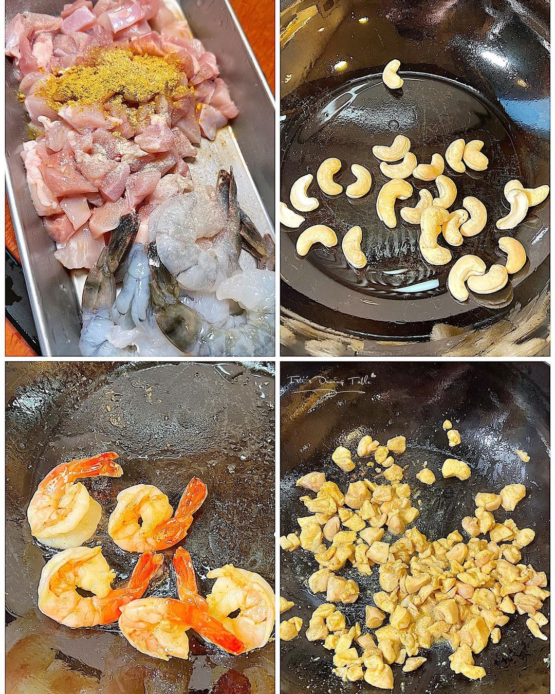3. 下油開鍋,分別煎香腰果,雞粒和蝦,盛起備用。