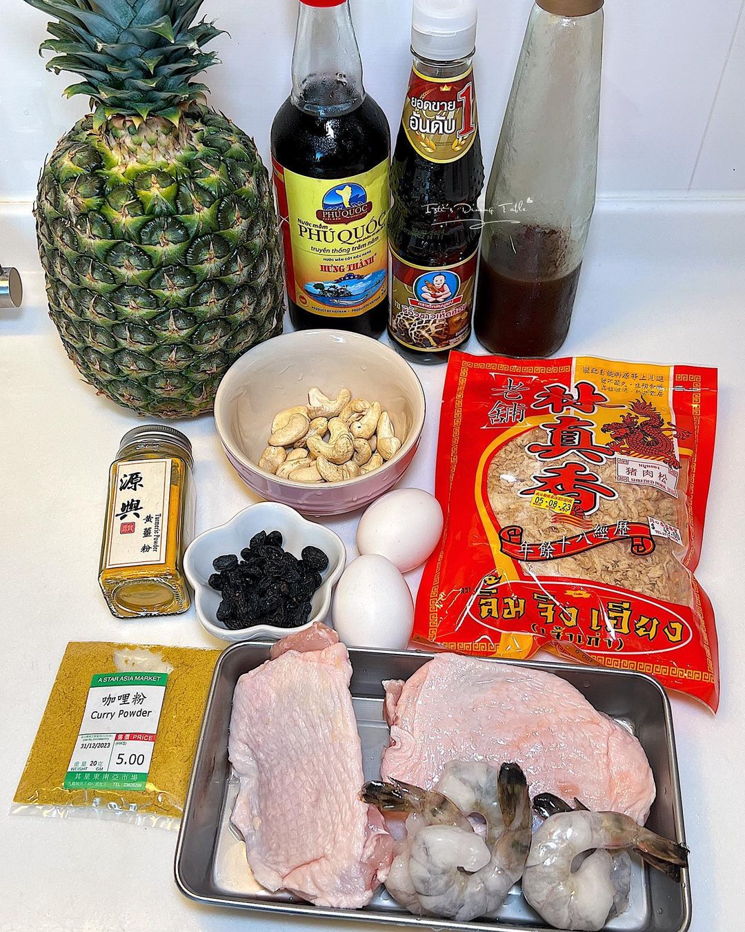 材料(2人份):白飯 2碗、菠蘿 1個、雞蛋 2隻、去皮雞脾扒 2塊切粒、蝦仁 6隻、提子乾、腰果、豬肉鬆
