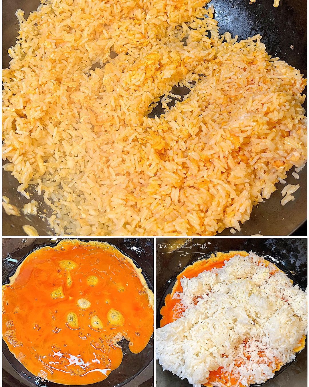 4. 2隻蛋拌勻,加入鹽和胡椒粉;下油開鍋,加入白飯,倒入蛋漿炒至每粒米飯都沾滿蛋汁,加入調味料和配料炒勻,最後加入菠蘿肉。