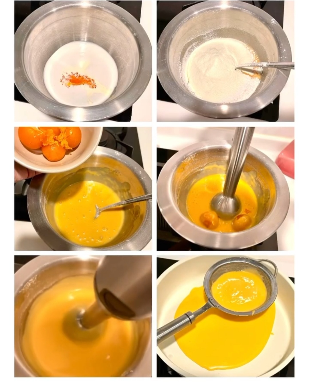 2. 所有粉類過篩,加入煉奶、椰奶、淡忌廉和蛋液攪勻,再加入咸蛋黃碎,用手提攪拌機打滑。