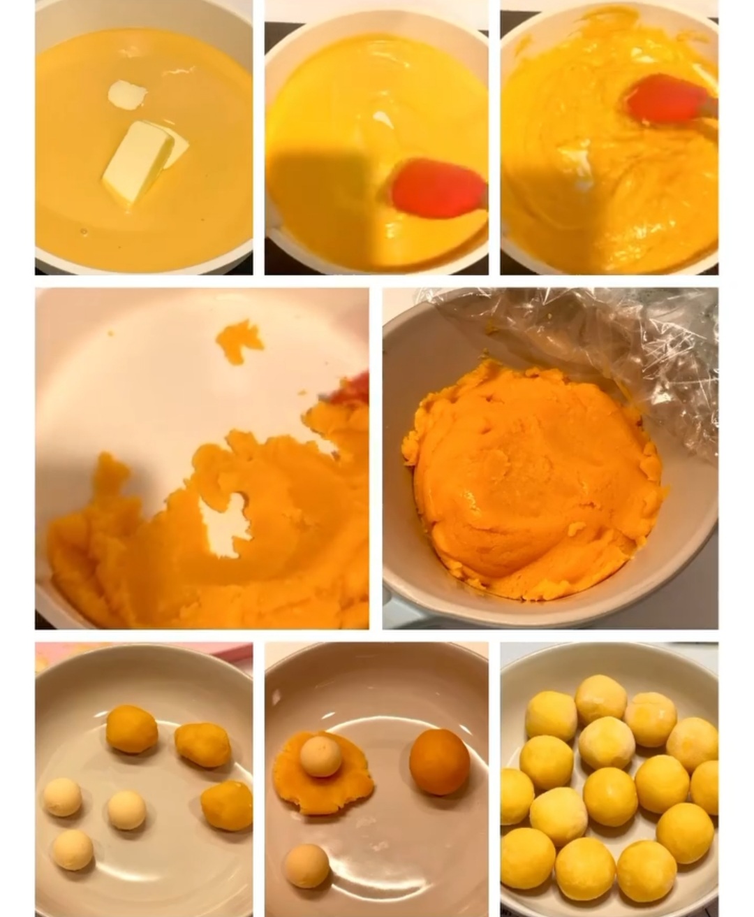 4. 南瓜餡:南瓜片和2茶匙淡奶混合,加入白豆蓉拌勻。