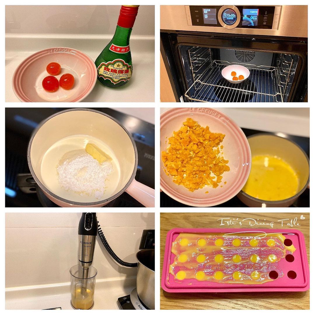 1. 鹹蛋黃掃一層玫瑰露酒去腥,蒸15分鐘後壓碎備用。