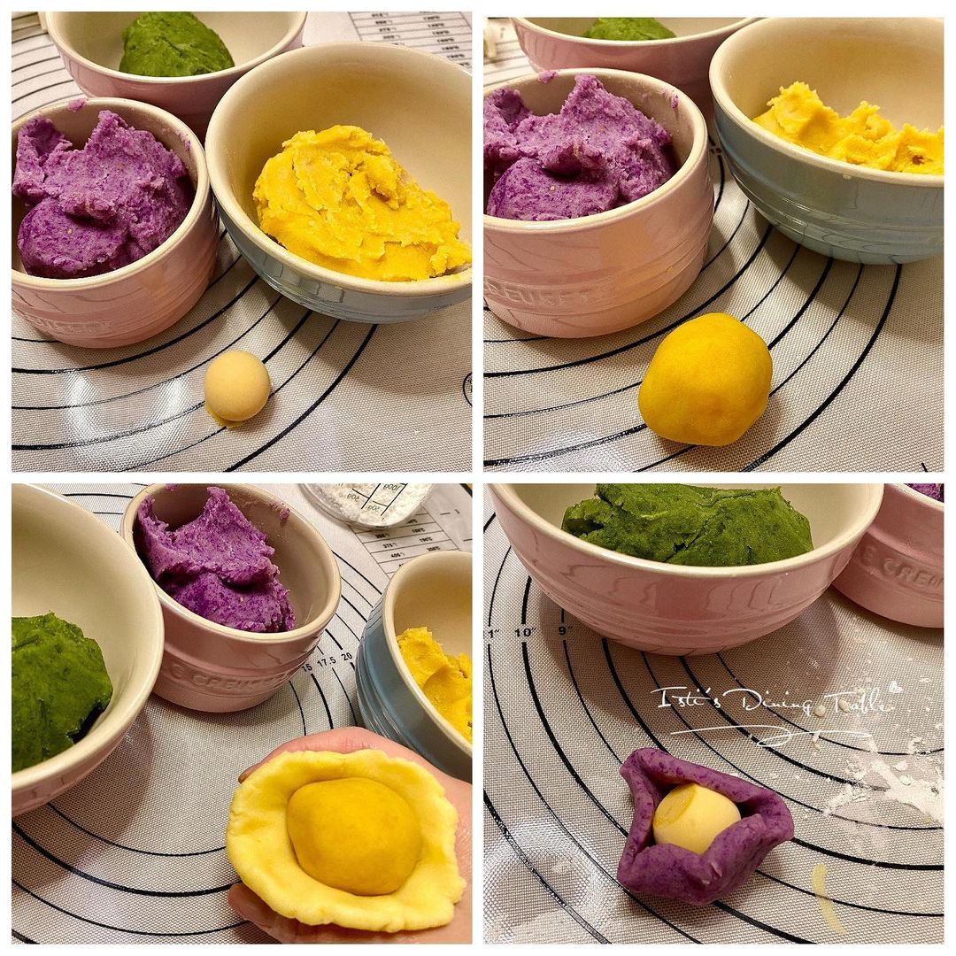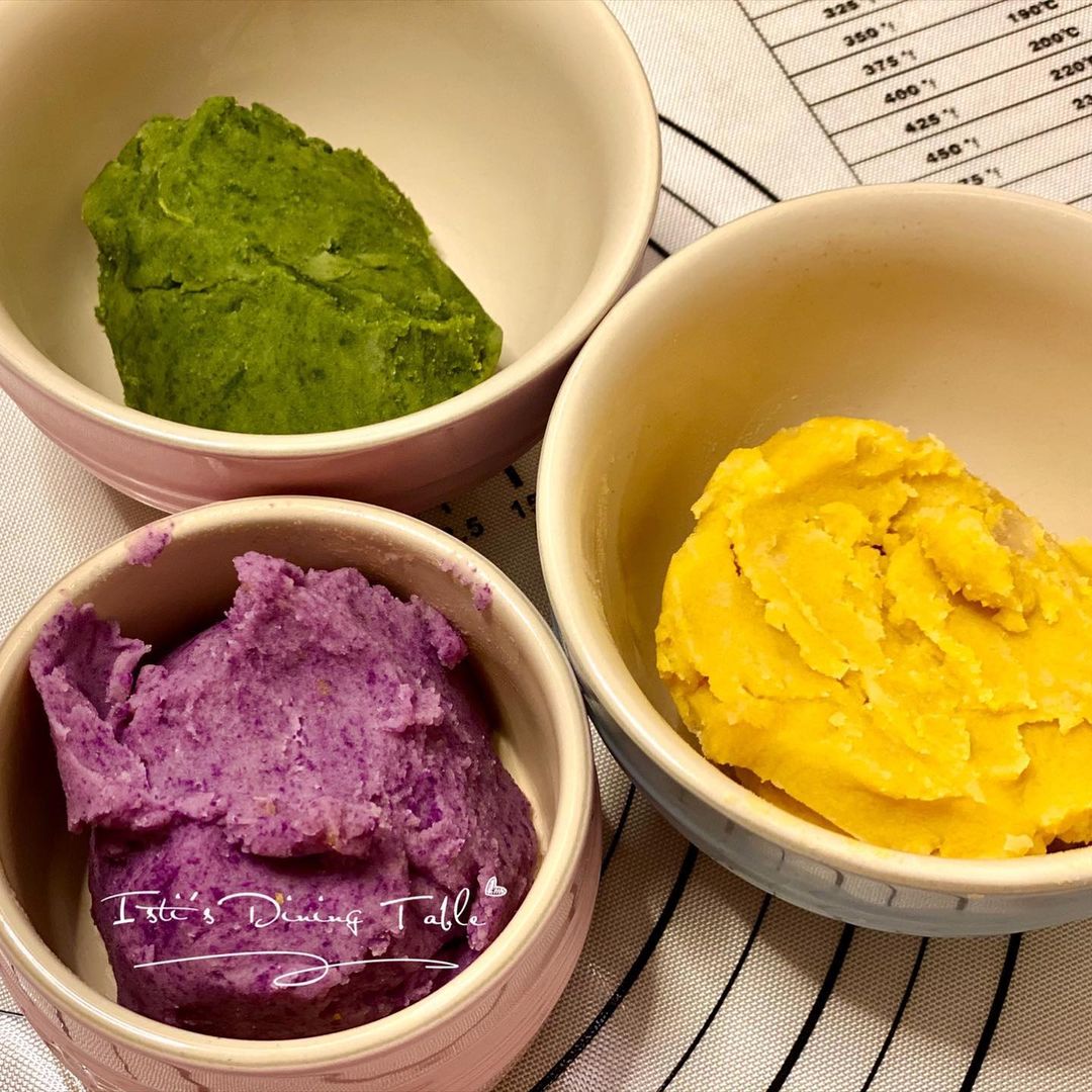三色餡(抹茶/南瓜/紫薯)材料:富澤白豆蓉 300g、抹茶粉 4g、富澤紫薯片 6g、富澤南瓜片 6g、淡奶 4茶匙