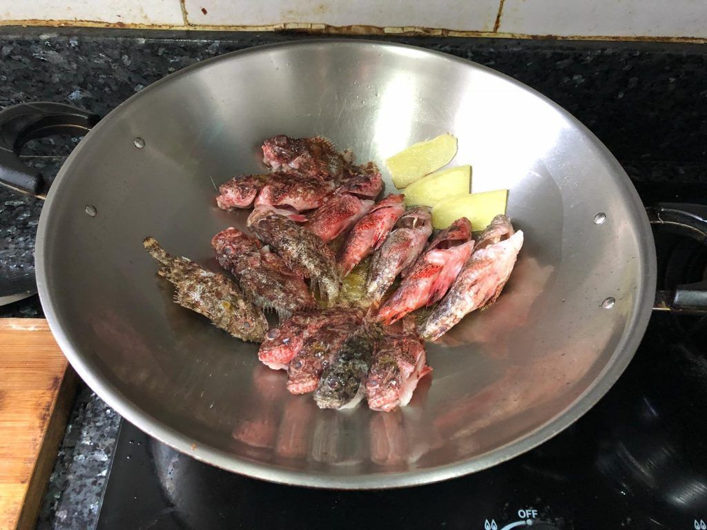 - 熱鑊下油及薑片,將魚兩邊煎至金黃後下大熱水,淨滾魚湯10分鐘