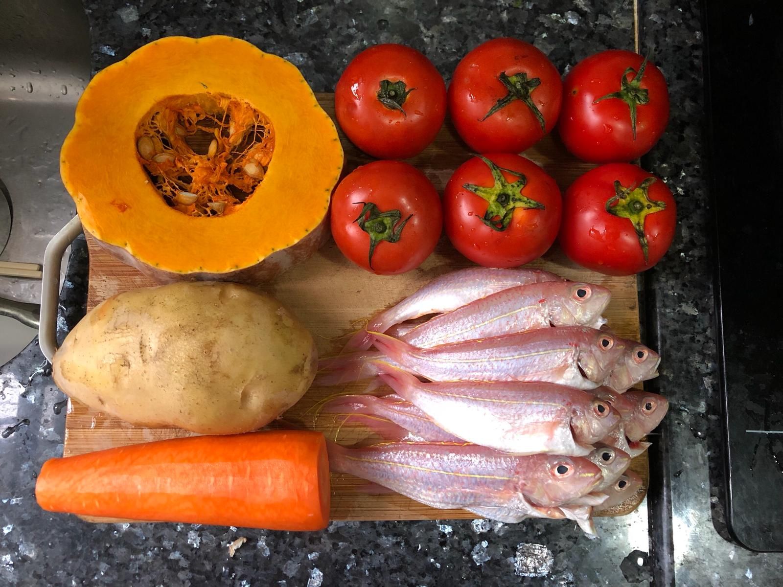 材料:南瓜、蕃茄、薯仔、紅蘿蔔、紅衫魚
