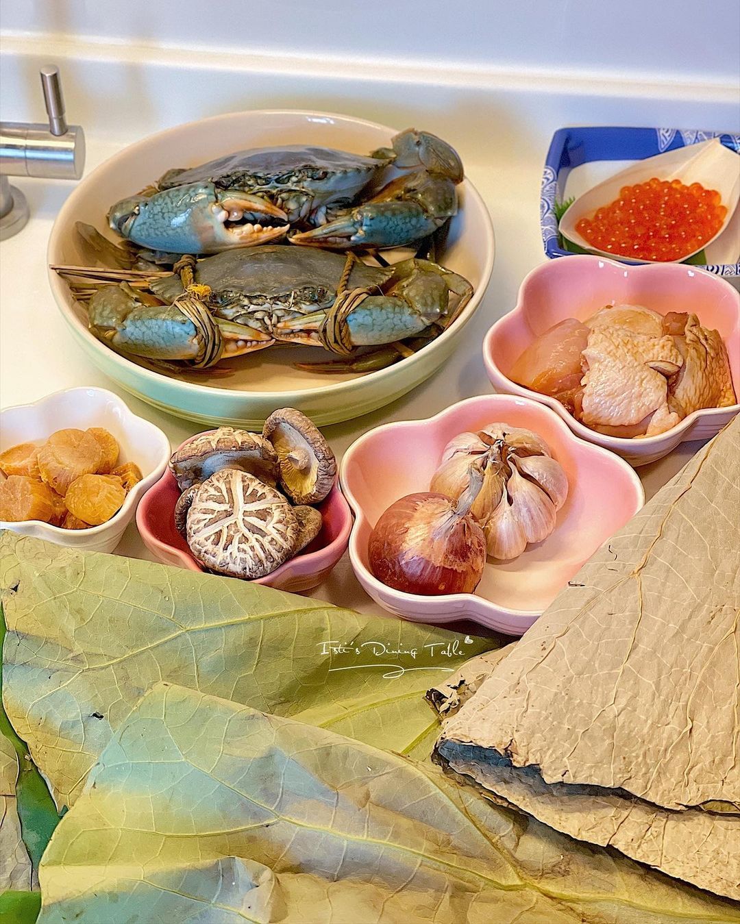 材料:膏蟹/ 奄仔蟹 1-2隻、乾荷葉、新鮮荷葉、白米 1.5杯、三文魚籽(可省略)