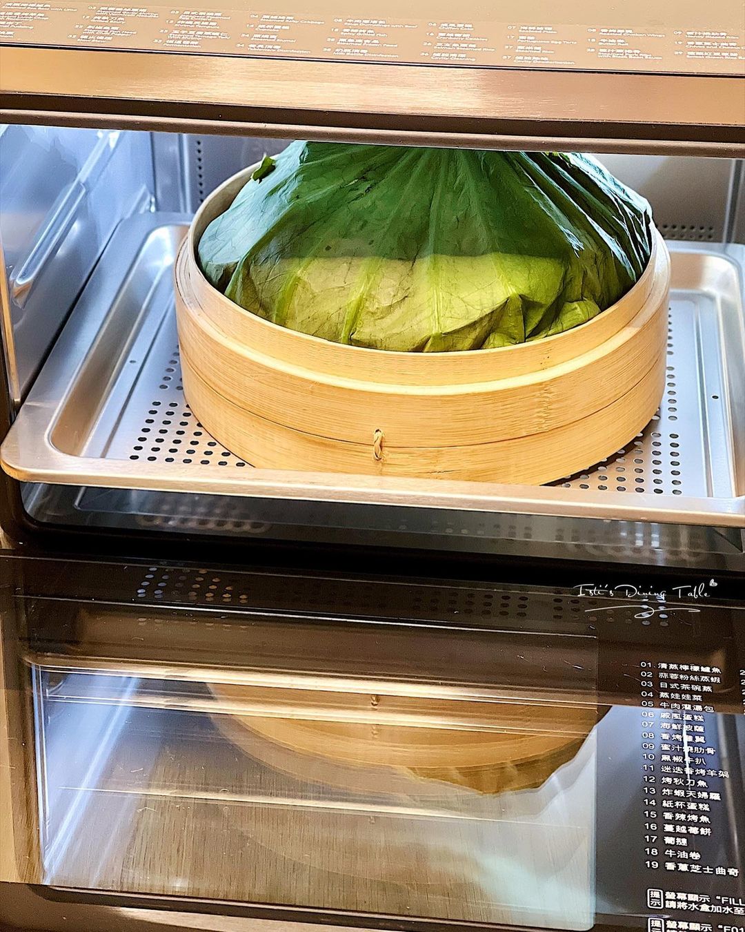 - 放入Toshiba Q20蒸氣焗爐 100度蒸45分鐘,煎開荷葉,鋪上三文魚籽即成。