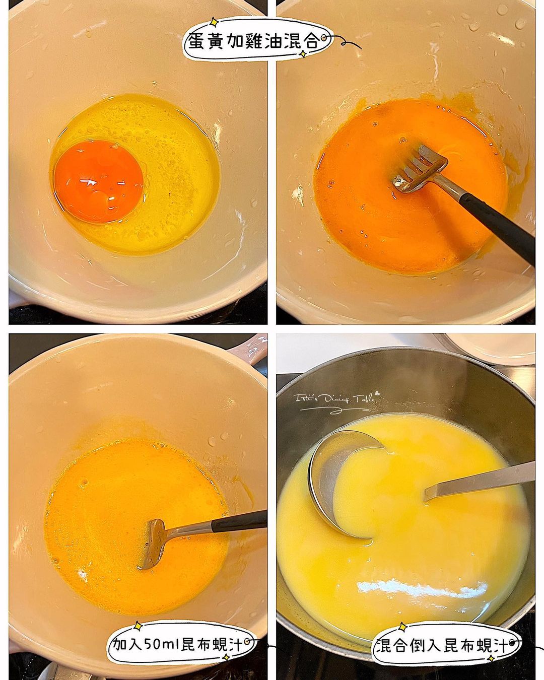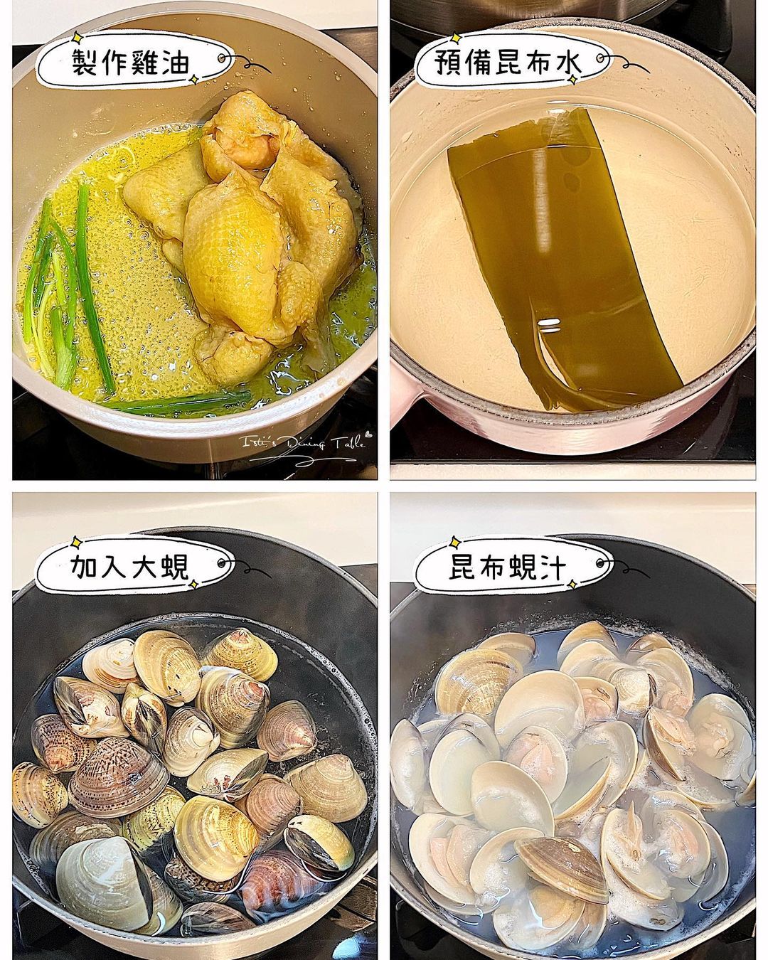這食譜靈感源自大班樓,重點是用昆布+蜆汁,而顏色金黃是因為加了雞油+雞蛋,令湯汁更加醇厚!