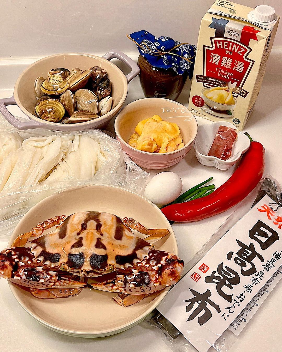 材料:花蟹 1隻約1斤、昆布 1片10cm、蜆 1斤、陳村粉 400-600g、雞皮 180g、蔥 1棵切段、紹興花雕酒 1湯匙、雞油 2湯匙