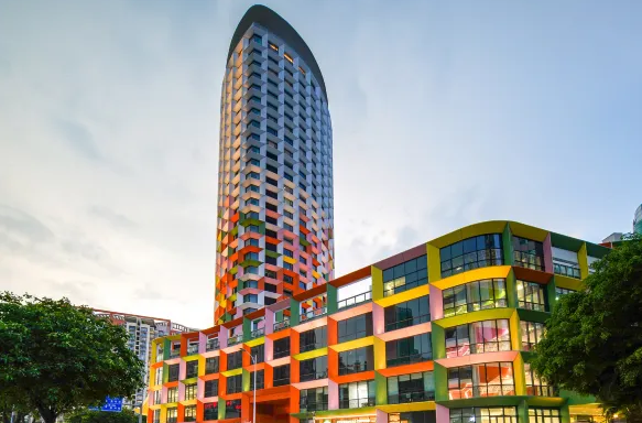 2023年開業的深圳憬居酒店坐落於有「彩虹大樓」之稱的景田婦兒大廈,家長帶小朋友入住後可以順道玩兒童探索館。酒店有多間童趣Party房,分別以尋寶地圖、愛的羽巢、多彩拼圖、夢遊仙境、糖果盒子、森林小屋、大象之屋為主題。其中愛的羽巢和大象之屋都設有攀爬設施和滑梯,可以讓小朋友玩樂。