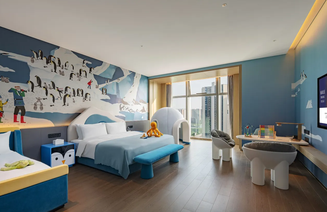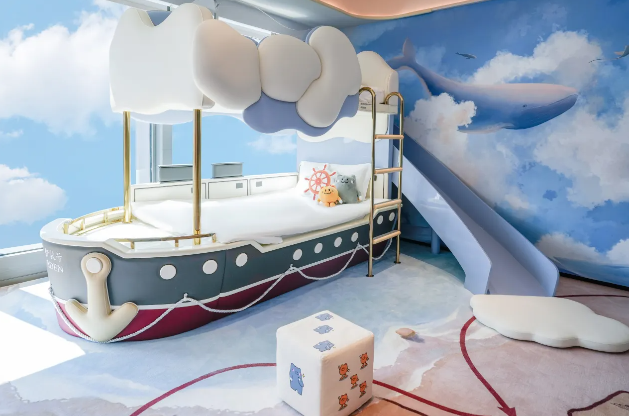 深圳國際會展中心洲際酒店位於寶安區,擁有15種房型,其中有洲際伊敦親子套房和親子主題房。洲際伊敦親子套房以淺藍和粉紅色打造航海主題,由滑梯、公仔抱枕到小茶几,每一樣設施的造型都十分精緻,非常適合小朋友打卡。