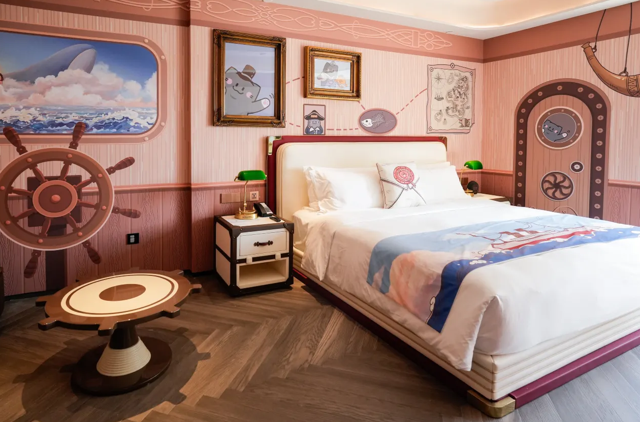 深圳國際會展中心洲際酒店位於寶安區,擁有15種房型,其中有洲際伊敦親子套房和親子主題房。洲際伊敦親子套房以淺藍和粉紅色打造航海主題,由滑梯、公仔抱枕到小茶几,每一樣設施的造型都十分精緻,非常適合小朋友打卡。