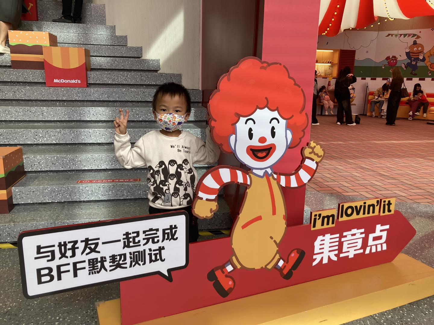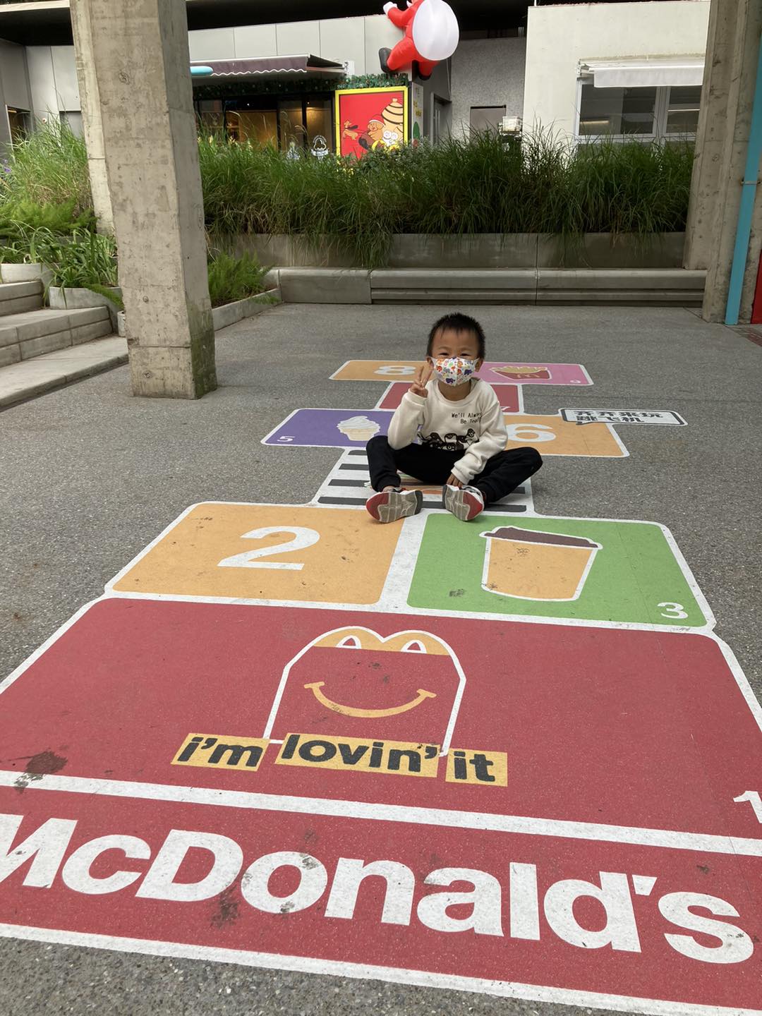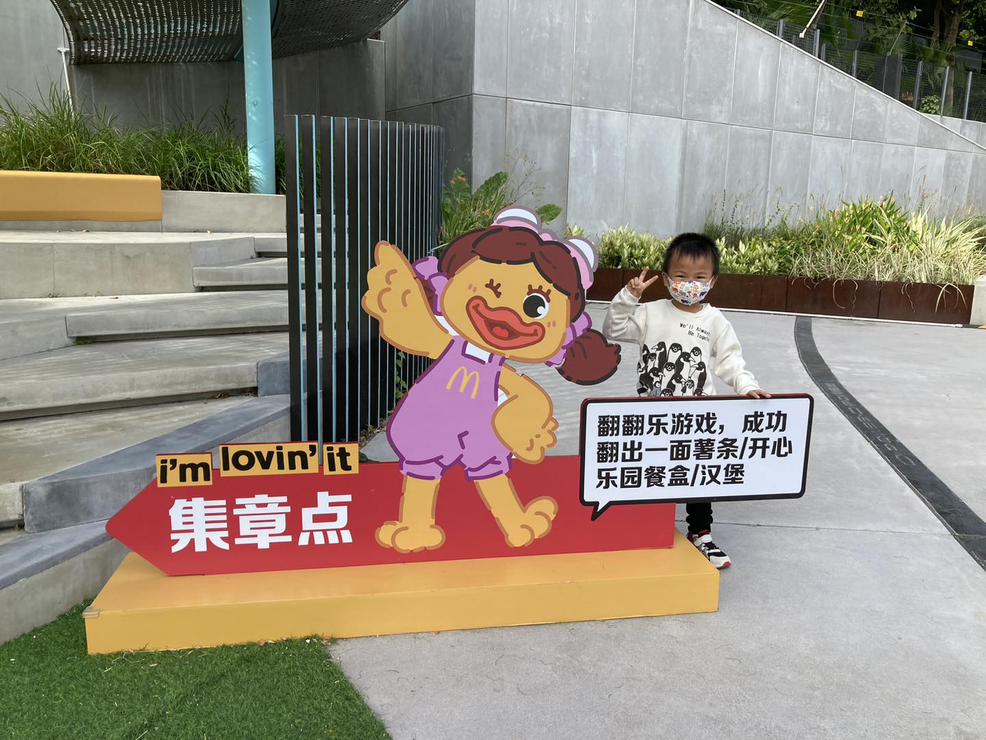 豬仔包媽媽分享,麥麥小鎮分為「戶外打卡區」和「室內開心劇場」兩個區域。她們一到麥麥小鎮,就已經可以見到麥當勞叔叔、漢堡神偷、滑嘟嘟和小飛飛迎接大家。豬仔包未打卡,就已經急不及待衝上樓梯去玩了。