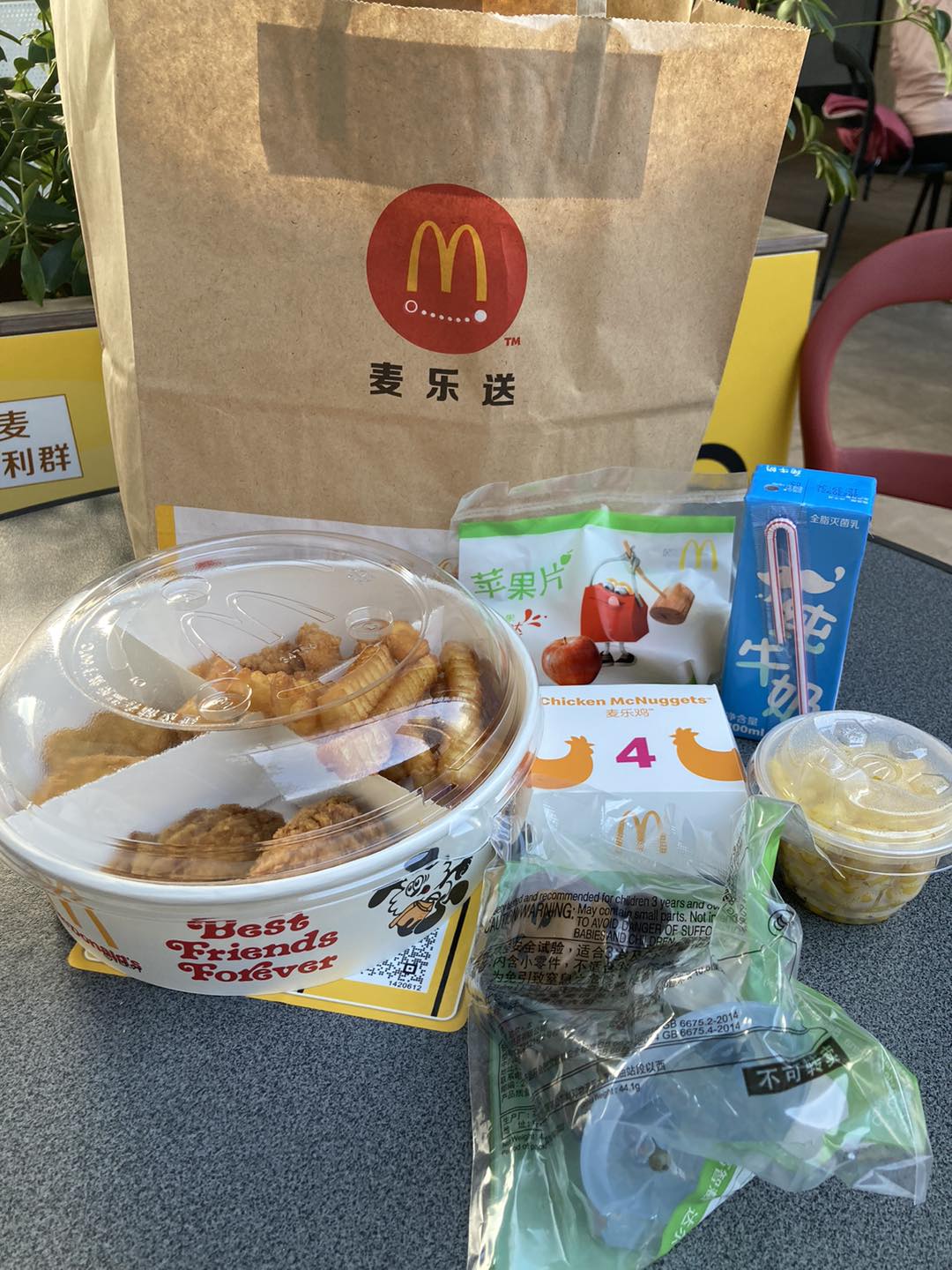 玩過一輪後,豬仔包一家去吃東西補充體力,現場有麥麥餐車售賣雪糕和飲品,但她們決定兌換「麥麥小鎮派對餐」餐券。兌換地點是在「天鵝湖麥當勞餐廳」,位置在麥麥小鎮對面商場,可以兌換到一份麥樂雞開心樂園餐,再加上一份四宮格小食盤,真的可以吃到飽。