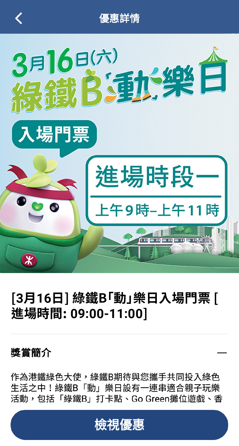 2.在「優惠」頁面中,揀選「綠鐵B『動』樂日」入場時間。