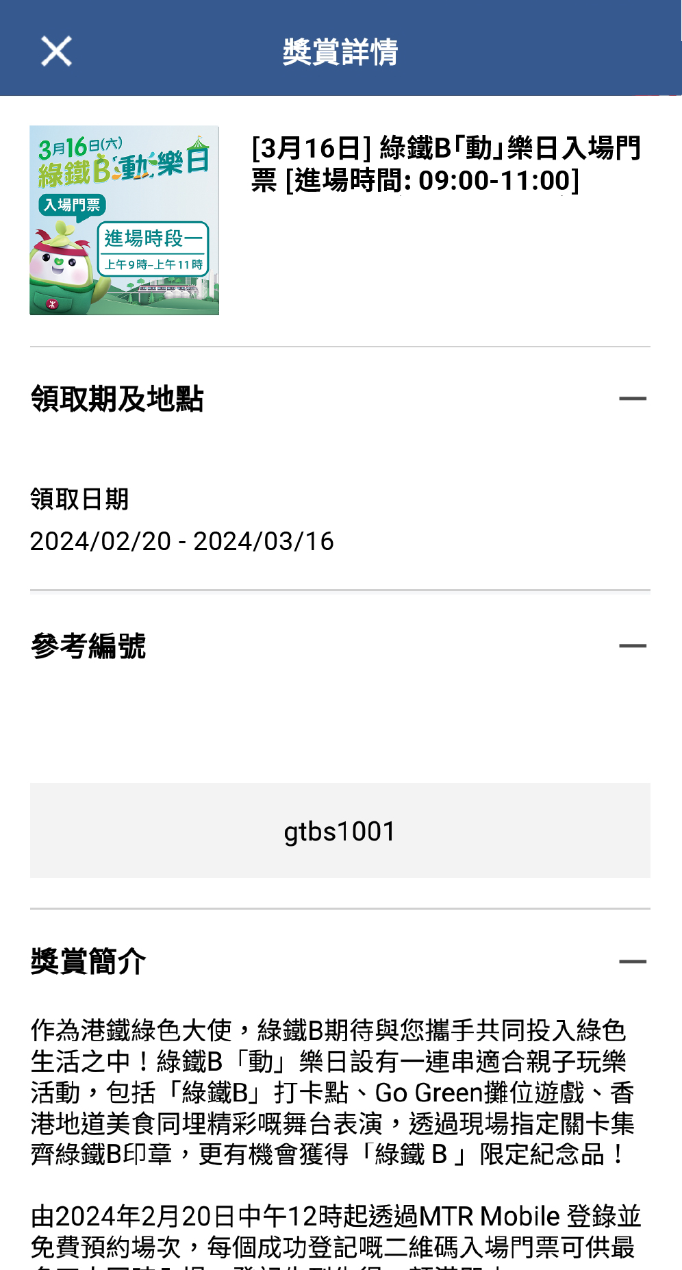 4.成功登記後,於「檢視優惠」將會顯示參考編號以確認記錄。二維碼入場門票將於48小時內,加到「獎賞」欄「禮品>有效」頁内。