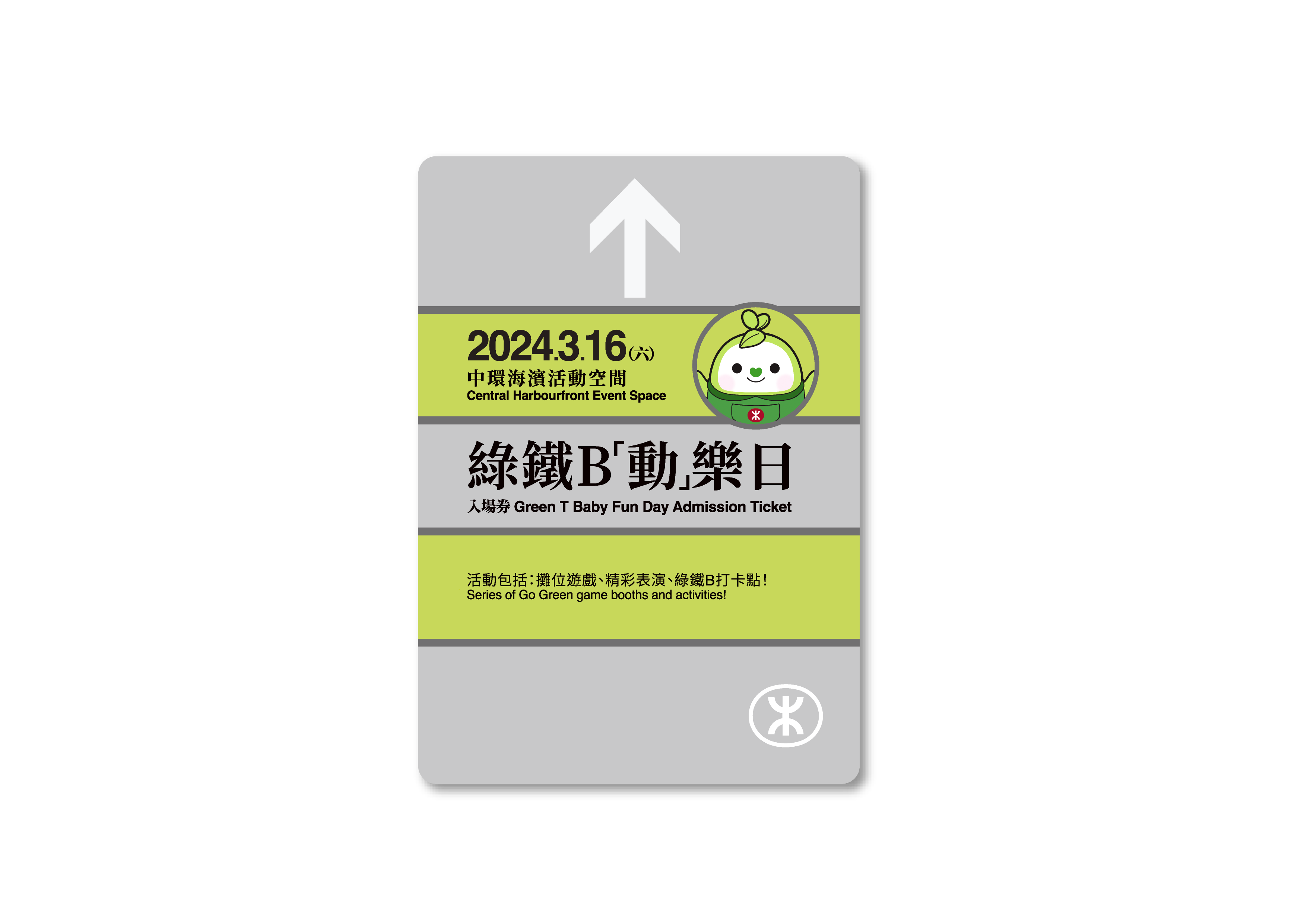 今次的活動入場票是以港鐵昔日懷舊單程車票配上綠鐵B作設計,十分值得收藏留念。大家還可以在現場玩遊戲、儲綠鐵B印章,便有機會獲得限定紀念品乙份,例如冰巾、水樽或環保鋁樽和裸買體驗。如果在現場上傳場地打卡照片到個人社交平台賬戶(公開),並hashtag #MTRHK #GreenTBabyFunDay 及 @mtrhk,就可以參加「野生捕獲綠鐵B」遊戲乙次,即有機會獲得限定綠鐵B吊飾乙個。