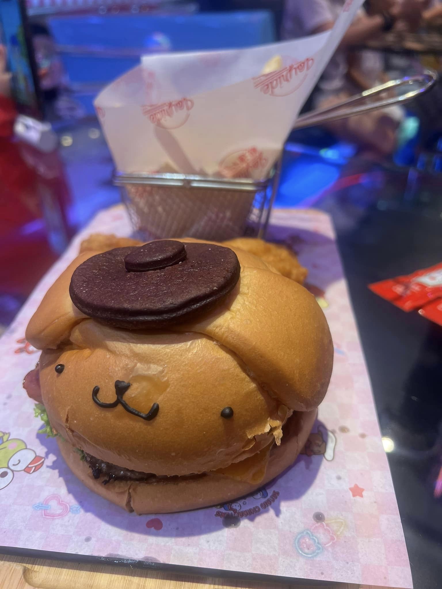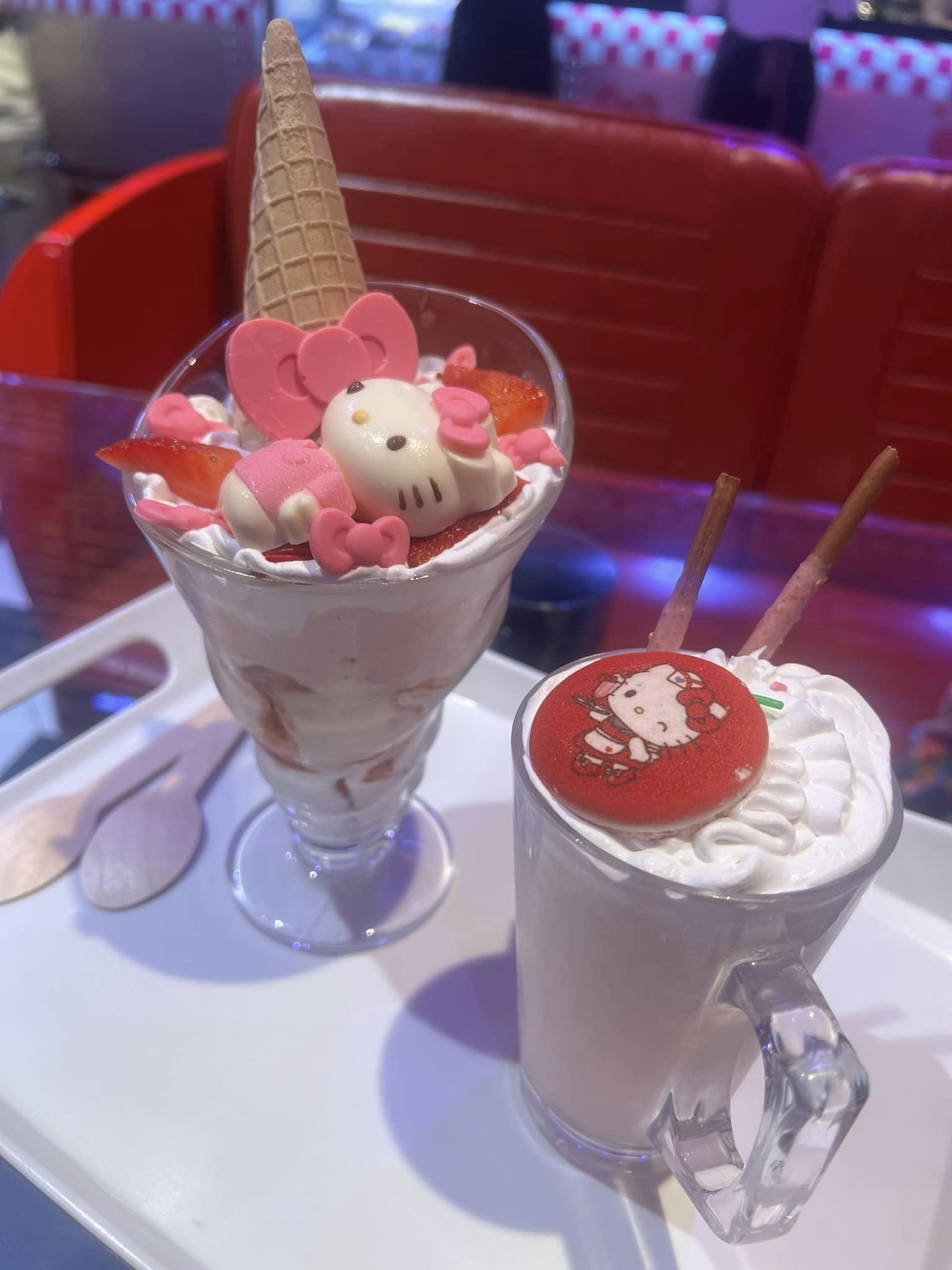 她們之後還去了位於新濠影滙的Sanrio主題美式餐廳,餐廳內有4架開篷跑車座位,拍照非常漂亮,打卡度100分!她們點了Hello Kitty雪糕新地和奶昔,以及布甸狗造型漢堡包套餐,款款造型超萌。