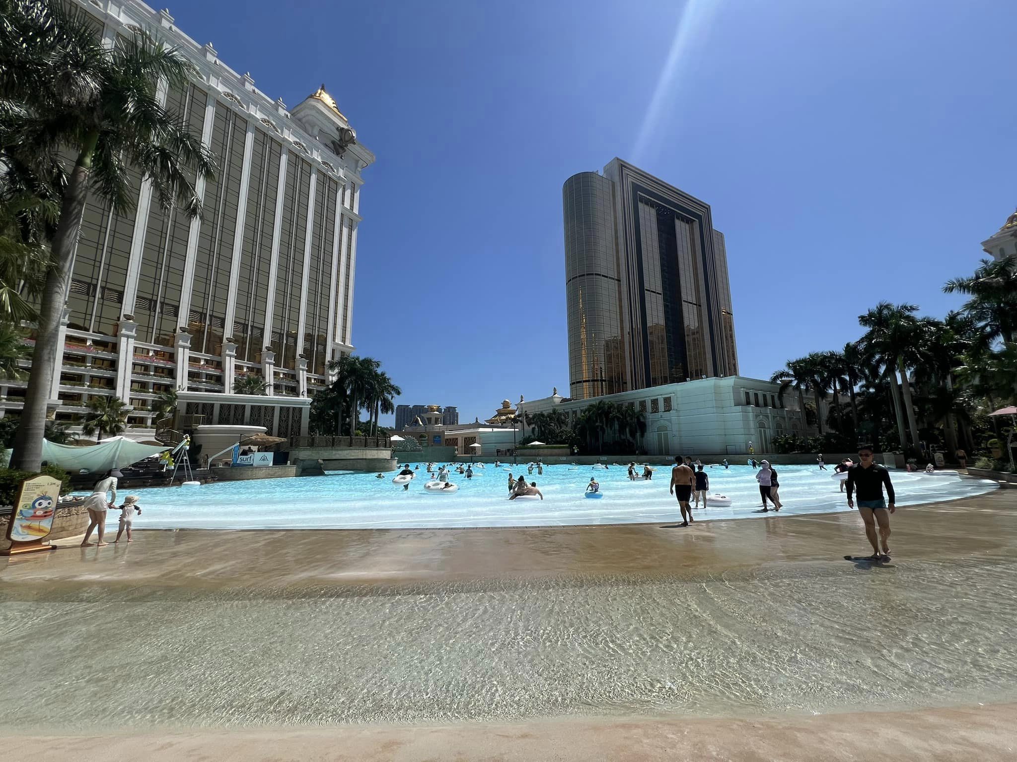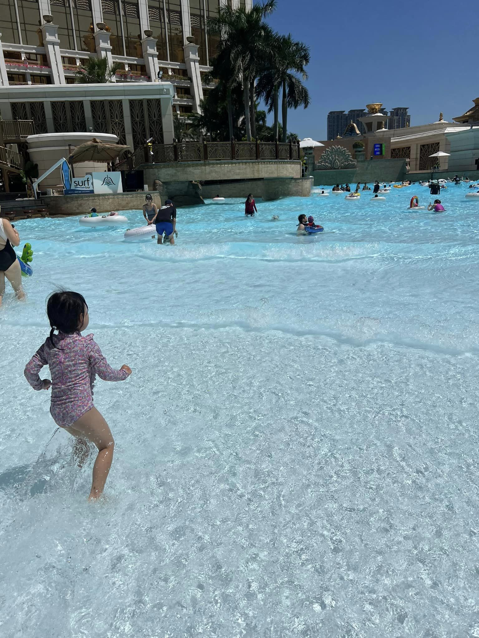 程b媽媽一家今次入住的是澳門百老匯酒店,所以可以免費去天浪淘園玩水。「天浪淘園」水上樂園佔地超過75,000平方米,被譽為空中水上綠洲,大家可以玩全球最長的575米空中激流、面積廣達8,000平方米的空中衝浪池、150米白沙灘、刺激的滑水天梯、兒童水上遊戲專區,以及兒童游泳池。程b媽媽還去了水中酒吧,品嚐了新鮮椰子消暑。