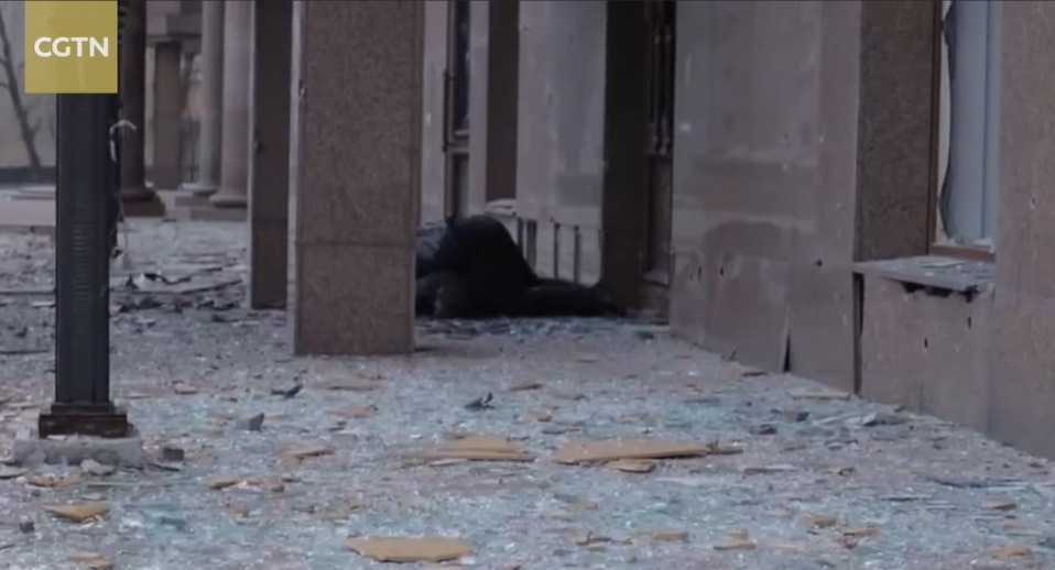 下一秒鏡頭轉向大樓入口處,看到兩名平民的屍體,他們身旁的地面被炮彈炸出一個洞,Dmitriy指該名母親以肉身擋在兒子面前,為他抵擋攻擊,但兩人最終還是難逃一劫,雙雙身亡。他們的遭遇令人非常痛心,這名烏克蘭母親在生命的最後一刻彰顯了母愛的偉大和無私。