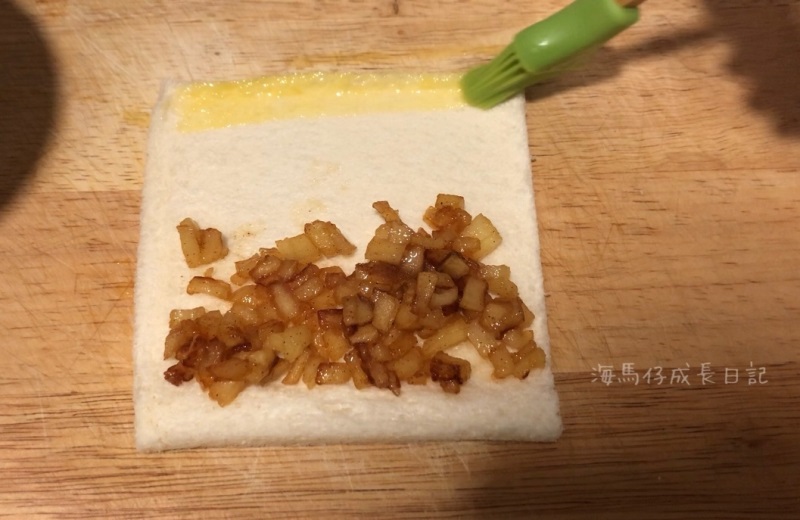 4. 壓平方包,放入蘋果蓉,於四邊掃上蛋液