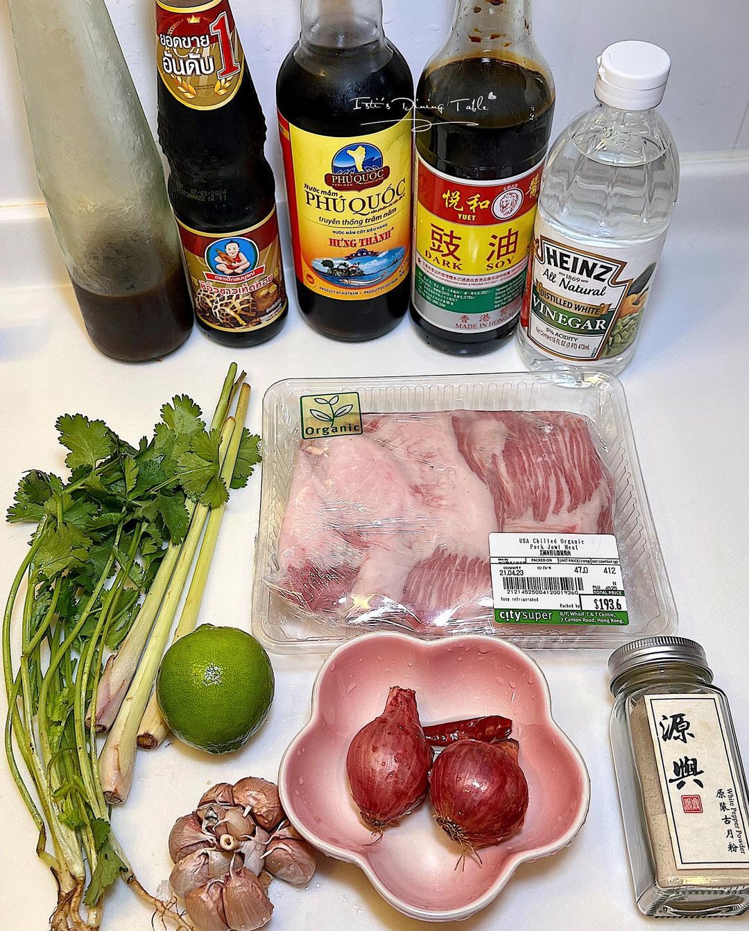 醃料:香茅 3條切碎、蒜頭 3粒、芫荽根 4條、生抽 2茶匙、魚露 2茶匙、蠔油 1 湯匙、砂糖 1茶匙、胡椒粉
