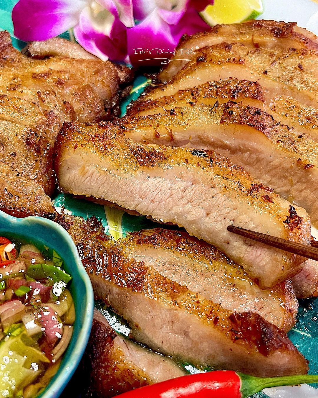 3. 焗盤鋪上錫紙,豬頸肉抹走表面醃料,200度焗9分鐘,翻面焗9分鐘,再用最高溫度/燒烤模式焗約1-2分鐘至表面焦香,斜刀切片,伴上泰式蘸醬食用。