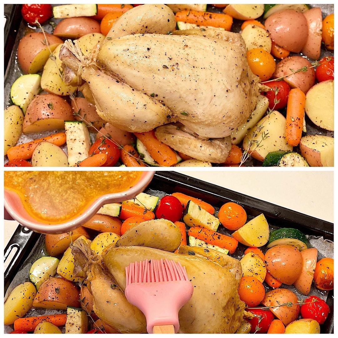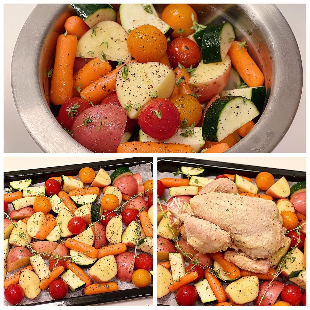 4. 蔬菜切件,淋上橄欖油,灑上鹽、黑胡椒碎,鋪上焗盤,然後放入春雞和百里香。